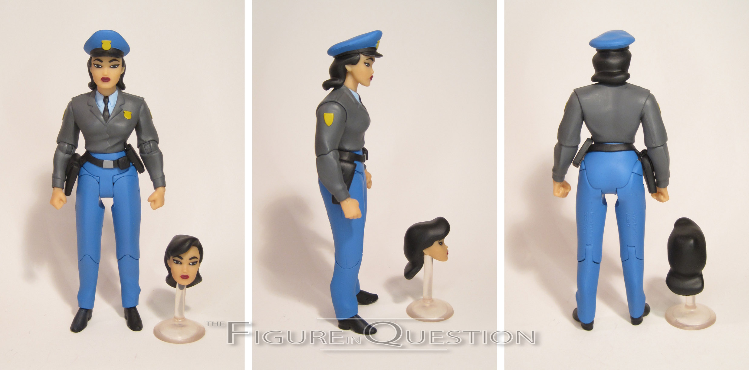 Fulfilling the “GCPD” segment of this set is Officer Renee Montoya. Montoya is noteworthy for being the second of B:TAS’s successful original creations that made her way back into the comics after the fact (following the immensely successful Harley Quinn, of course). Montoya is the one wholly unique figure in this set. She’s wearing her beat cop uniform, since she didn’t make it to detective until TNBA. The figure stands about 6 1/4 inches tall and she has 22 points of articulation. Her articulation works better than some of the Batman: Animated figures I’ve looked at, which certainly makes me feel a bit better. Her sculpt is definitely one of the strongest in the set, recreating her animated design rather nicely. She avoids being too devoid of detail, another issue that plagued some of the line’s other figures. Similarly, her paint is also very strong. The application is nice and clean, and the colors all match up with her on-screen appearance. Montoya is packed with an extra head, a handgun, a shotgun, four pairs of hands, and a display stand. The head offers Montoya without her hat, which I guess is nice, in theory, at least. In practice, it’s just very annoying. Why? Because, thanks to the design of the double barbel DCC’s used for her neck peg, if you’re not careful when swapping out the heads (a very difficult task, I might add), then the peg will pop out of the neck, rather than the head. I ended up having to spend about 20 minutes removing the barbel from the second Montoya head to put the one with the hat back on, and after all that, the peg is mangled to the point that I doubt I’ll be able to successfully swap it again. Okay, but what about the guns? Well, they look nice, but I almost broke both of them taking them out of the package. Also, despite the plethora of hands included, there’s not really a combo that can properly hold the shotgun.