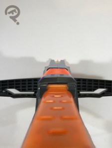 pulled off pretty well with just a couple drawbacks. First and foremost is in the pistol grip. Along the front seam where the two light grey halves meet, the screws are placed just far enough that the plastic can flex and produce a hard edge where it splits. At the best, its abrasive over time or if you’re holding onto the blaster tightly, and at worst it can actually pinch my fingers. It seems like adding another internal support wouldn’t have been too much trouble so it’s irksome to find it absent from the design. Ultimately it’s a minor complaint, and my second complaint is even more so. I’ll sum it up here: “By the goddess, that’s a lot of orange in one place.” Yes, it might have been nice to see some other colors on the front end, but it is what it is, I guess. Barring the issue with the grip, the blaster feels good in the hand. It’s stout but solid, giving it a sort of combat shotgun kind of feel. I do wish the cylinder could be loaded from the rear and that the ratchet on the cylinder could be indexed by hand a little easier, but ultimately it’s functional so I can’t really complain. For all its petty aesthetic and operational quirks, the Surgefire actually makes up for most of it in performance. Shots feel like they have more energy behind them than a lot of other recent blasters, flying far and hitting hard. You should really think about whether or not your younger sibling has earned it before you bust into their room and open fire with the Surgefire. Not as much as with, say, a Rival blaster, but more than just popping them in the head with a Jolt. The Surgefire comes packaged with the cylinder which snaps into the blaster and 15 Elite darts.