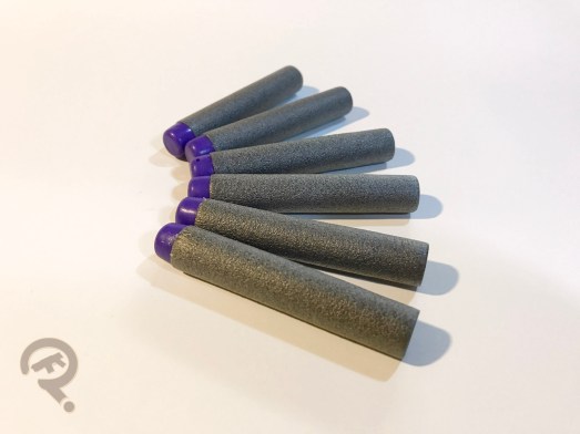 touching them. Opening the front covers is required to fire the second barrels on the top and bottom. The blaster is very sleek and definitely has an appropriate sci-fi feel to it, almost like one of the plasma weapons from Halo. The grip could maybe stand to be a little bigger as I could see someone with larger hands feeling cramped while holding it, but it’s forgivable when you remember the target audience. The main body of the blaster feels on par with other Nerf blasters in terms of structural integrity, but it is worth noting that the plastic for the priming slides feels a little thin, and the front covers are a smoother, slightly more rubbery plastic than the rest of the blaster. The priming stroke on the Quad Blaster is very short and not terribly heavy, as such, the performance is limited. It’s still fine for running around the house, blasting your friends, but even on longer indoor distances, the darts tend to drop off a little sooner than I might like and the impacts can feel kinda flaccid. Again, I can understand this decision given this is meant for children, and Nerf has to keep it’s own core products competitive, but it’s still a bit of a bummer. The Star-Lord Quad Blaster comes with 4 Elite darts but with black bodies instead of the traditional blue. Unfortunately I wasn’t able to find all 4 of mine but I got 2 and some regular Elites for comparison.