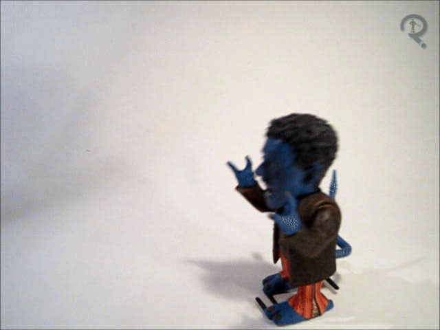 NightcrawlerTwist2Tail Whipping Nightcrawler was released in the Movie Series of Marvel Motorized Twist ‘Ems, as one of the two figures based on the recently released (at the time) X-Men 2. The figure is about three inches tall and, while his shoulders, hips, and neck all have “joints,” they aren’t really articulated, due to the motorized nature of the figure. They move pretty well when the wind-up feature is activated, but they’re not of much use for anything else. The sculpt takes the design of the character from X-Men 2 and “twists” it into a more super-deformed style. The body is where most of the styling kicks in, with short, stubby arms and legs, and larger hands and feet. In proportion, the head is really huge. In fact, the head is pretty much just a 1/6 scale sculpt of Alan Cumming as Nightcrawler. The head sculpt is really well done, with plenty of detail and an excellent likeness of Cumming. Were one to want a Hot Toys-style Nightcrawler, this sculpt would definitely be a good starting point. It’s a little weird to see this detailed a sculpt on a “cartoony” figure like this, but the details are fairly present throughout the rest of the figure, so it blends well enough. The body is subject to a little bit of intrusion from the wind-up mechanisms, but the tabs on the feet and the winding gear aren’t too obtrusive, just obviously present. The figure’s paintwork is generally pretty good. The colors all match up pretty well to the movie look, everything is applied pretty cleanly, and there’s plenty of small detail work that adds a lot of dimension to the figure. Some areas, such as the jacket, are a little bit on the more simple side, but it works pretty nicely. Nightcrawler doesn’t have any accessories, but he does have the wind-up feature. When wound up, his legs walk him forward, his arms move up and down, and his head goes side to side. Interestingly, despite the name, the tail doesn’t really move or whip.