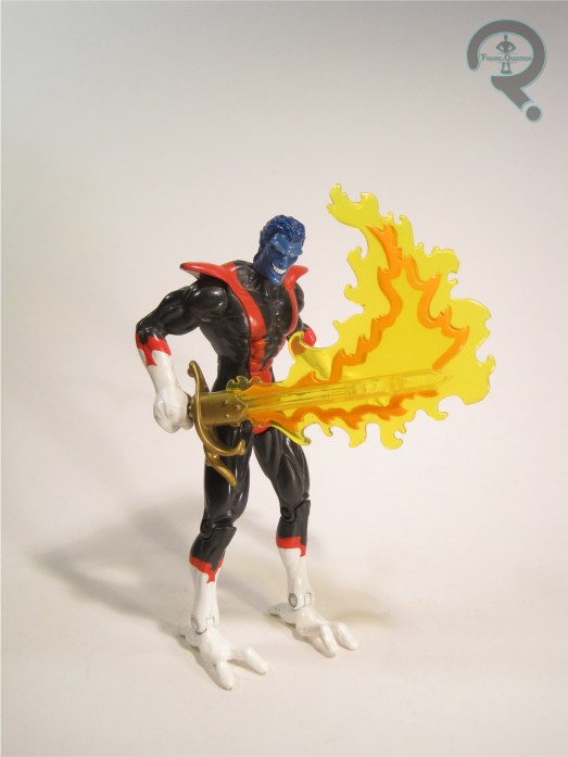 Nightcrawler was released in the above mentioned “Classic Light Up Weapons” set of Toy Biz’s X-Men in mid-1996.  It marked his second inclusion in the line, after a rather lengthy hiatus following his Series 1 inclusion.  The figure stands about 5 1/4 inches tall and he has 10 points of articulation.  Like the others in this assortment, his light up feature hampers the movement on his right arm, and his left removes the usual elbow joint in order to more properly match-up.  He does, however, gain ankle joint movement, which is quite useful for him, as well as an additional cut joint at the base of the tail (which is not bendable this time).  Nightcrawler gained an entirely new sculpt for this figure, and one more in line with the line’s stylings by this point.  It’s not bad, but it’s definitely removed from the more classic interpretations of Kurt I tend to prefer.  It also makes him a bit taller than he really should be, as well as amping up the definition in his muscles.  At least he wasn’t as majorly bulked up as the other male figures in the set.  Nightcrawler’s paint work is generally pretty decently handled, with all the usual colors.  There was a variant of this figure with less of the usual colors, which swapped out silver for the spots that are usually red.  It was an odd color variant, but it was there.  It’s not one of the one’s I have, though.  Nightcrawler’s only accessory was a sword, which was also the source of most of his gimmick, as it wasn’t just any sword: it was a flaming sword.  Pretty nifty, and definitely on the better front as far as the light-up accessories for this set went.