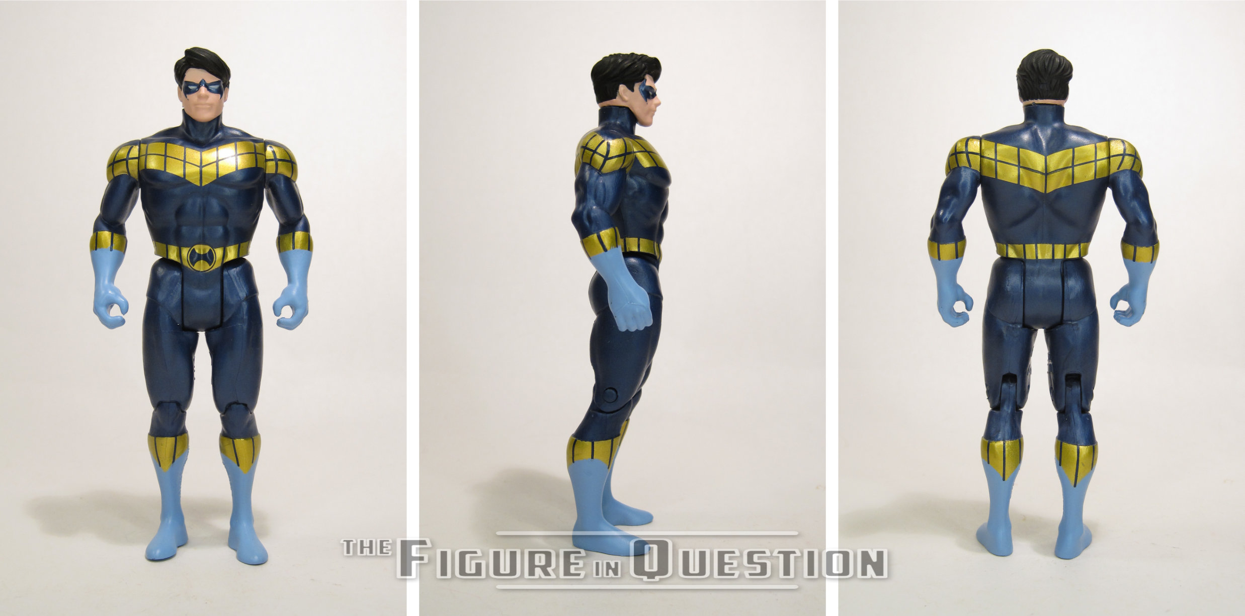 Nightwing — Teen Titans is part of the fifth “Digital” assortment of DC Multiverse, meaning he’s pretty much just a standard figure, but there’s also an extra card that literally no one will ever make any use of. He’s officially under the “DC Direct” banner, alongside wave-mates Batman and Monarch. He’s the eighth version of Nightwing under the Multiverse line. The figure stands 7 inches tall and he has 37 points of articulation. Nightwing is built on the Beetle/Booster body, which has been a favorite starting points for mid-sized characters. Nightwing himself has used it once before, for his ‘90s costume. This time around, it actually gets a few adjustments to make it more accurate. He adds the collar to the torso, as well as finally re-tooling the shins so as to redo the boot-tops, so that he’s not yet another figure saddled with the weird boot tops. Instead, he’s got the proper, slightly more unique design for this costume. He’s also got a brand new head sculpt, clearly patterned on Perez’s illustrations of the character in the early years. It’s a very nice sculpt, with a lot of really sharp and clean work, and, above all, it’s a happy Nightwing, which I
