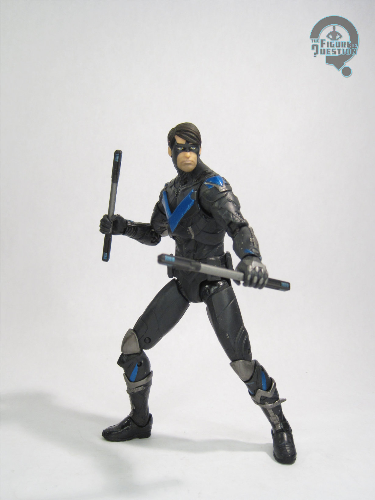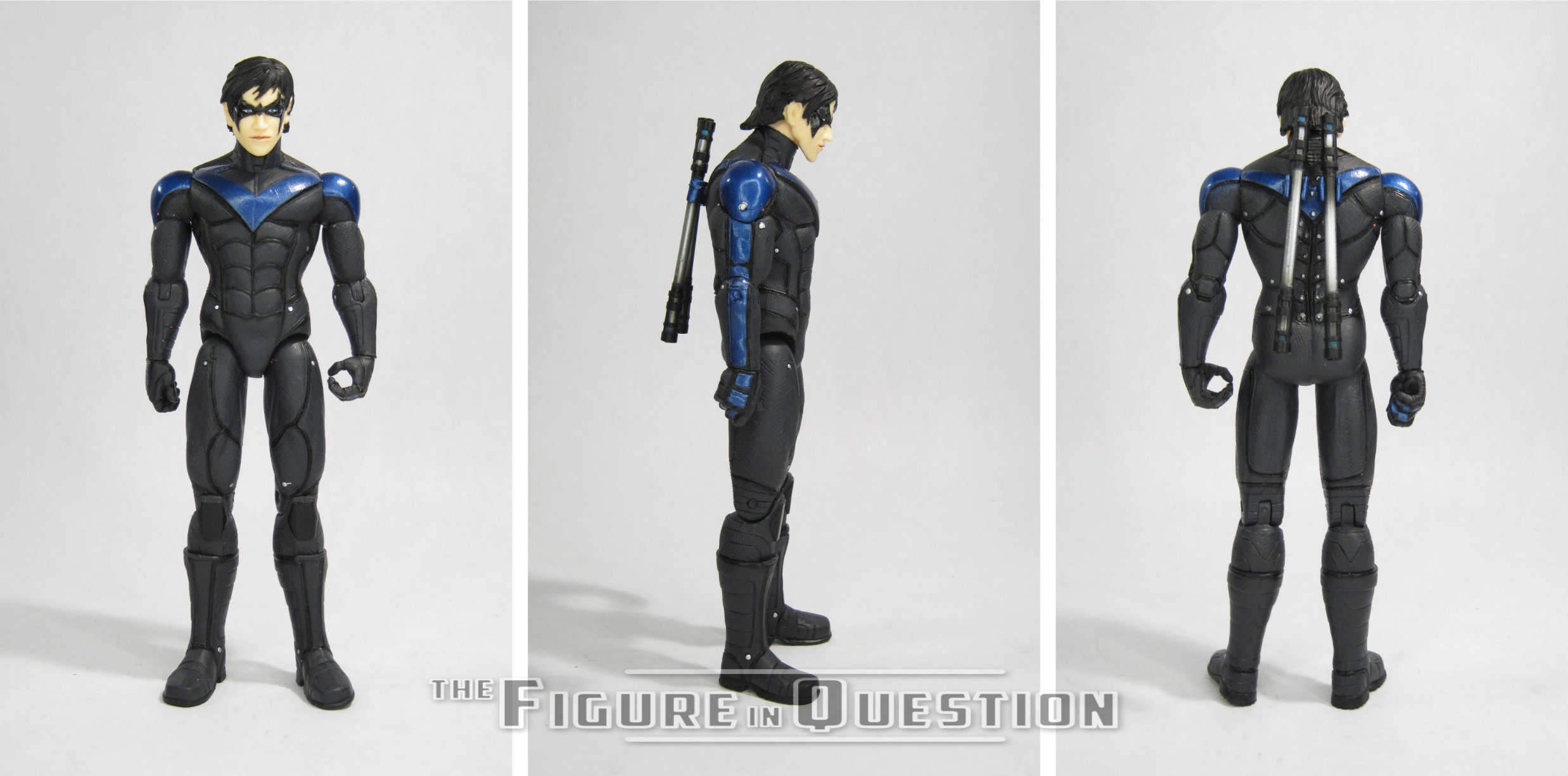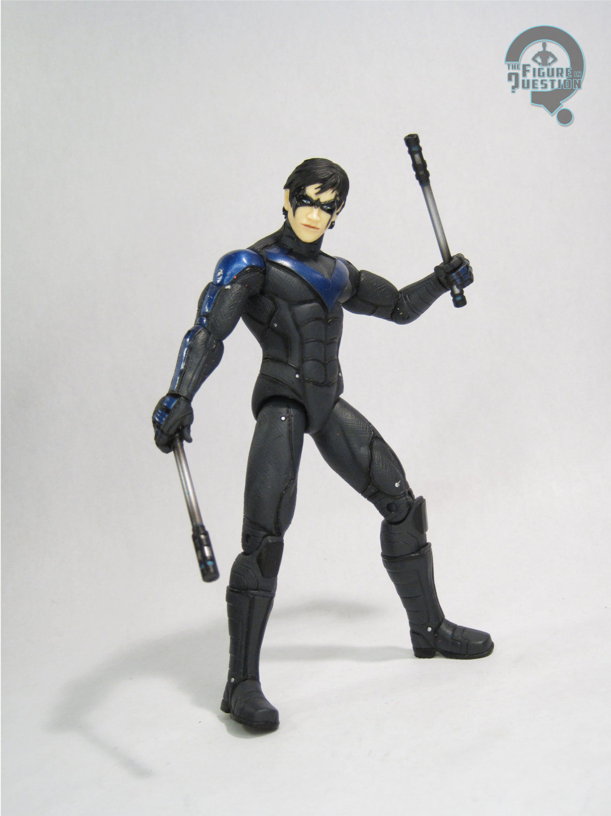 always appreciate seeing, especially in this costume. It’s certainly the nicest of the Nightwing head sculpts we’ve gotten from McFarlane. The paint work is generally okay, though it does wind up with some slight oddities. The mask gets a pattern suggesting shading, which I don’t mind, as it’s effective and doesn’t look weird. That said, it’s the only instance of painted shading on the figure, which is strange. The rest of the work is more basic stuff. Application’s clean and sharp, so that’s good. The only off spot is the shoulders, which are already kind of off due to the way the assembly works, but then also miss the lighter blue on the top section. You can kind of hide it with posing around the shoulder “cups”, but it’s odd when you can see it. Nightwing is packed with a batarang, a display stand, a collector’s card, and the card with the info for the “digital” collectible.