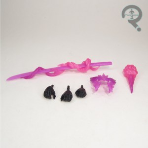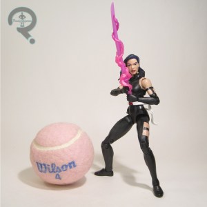 front. It’s a subtle, but notable improvement over the prior piece, and I like it a lot more. Beyond the new sash, all of the differences for this figure are paint-based. It’s a pretty solidly handled application. The costume’s details are nice and clean, and they’ve actually improved on the hair paint from the prior release a whole lot. Psylocke includes the same accessories as the last release: a psychic effect, a katana, and a psychic knife, all molded in translucent pink, but now with a little extra purple detailing. In addition, she also gets a spare left hand, in a grippilng pose, so she can now hold her sword with both hands.