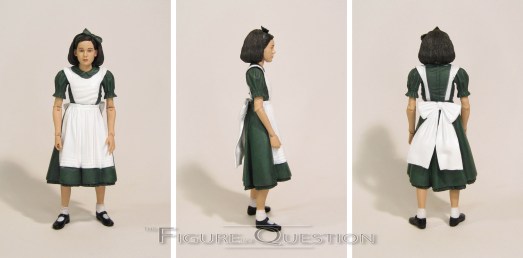 Ofelia is figure 3 in the Guillermo del Toro Signature Series from NECA, following Santi from The Devil’s Backbone and the Pale Man, also from Pan’s Labyrinth. She’s the middle of the three Pan’s Labyrinth figures, and actually works as a pretty solid bridge from Pale Man to Faun. Ofelia is seen her in her green and white party dress, which she wears on her way to the first of the three challenges from the Faun. It’s not a particularly long-lived outfit, but it’s somewhat important to the plot, and definitely her most distinctive look from the movie. The figure stands 5 inches tall and she has 28 points of articulation. The articulation on the upper half of the figure is definitely well-implemented, but the legs, especially the hips, are rather restricted by the thick plastic dress. There’s no easy solution to that, though, and I can’t really fault NECA for choosing aesthetics over performance on this one. It’s not like Ofelia’s going to need to get into a ton of action poses, so this should do. Ofelia’s is a pretty decent recreation of her appearance in the movie, though perhaps not quite as strong as the Faun was. She overall seems a little too stretched out and lanky for actress Ivana Baquero in the film. I had a similar complaint about the Newt figure from the Aliens line. I think it’s just something that comes with the translation from real person to articulated figure. The likeness on the head also isn’t the best we’ve seen from NECA. It’s not bad, but it’s not quite right. The hair is definitely throwing it off somewhat, as is the slightly blander