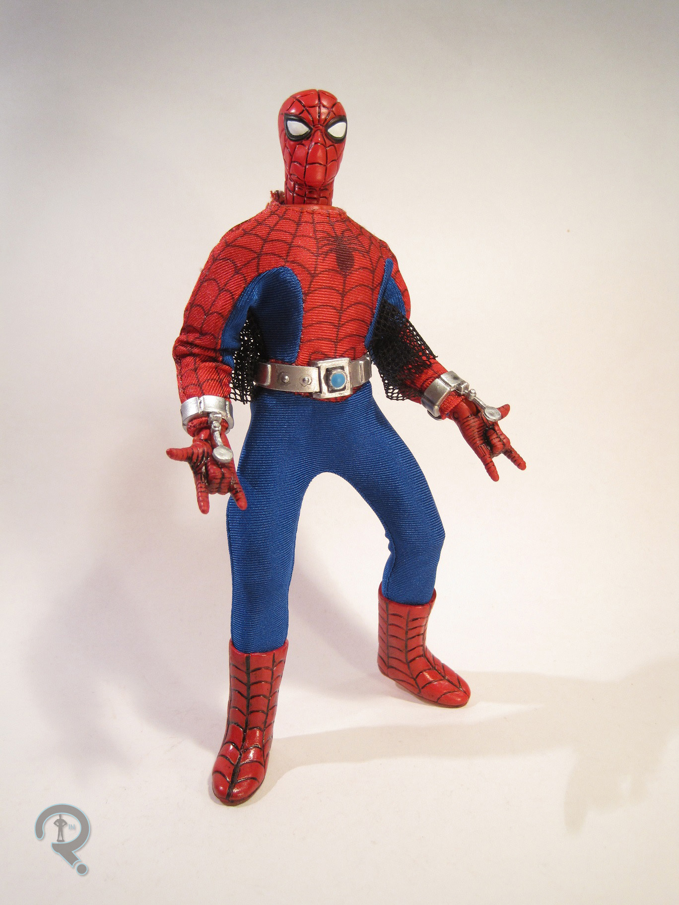 actually look pretty respectable. That can’t really be said for most attempts at replicating them. The weblines on the red portions of the costume are finer, though they are oddly a little lighter, as well, which doesn’t seem to have been the intent. They end up being more of a brown than a true black. It’s a minor nit with an otherwise very nice costume. While the original Spidey had printed on boots, this one has a pair of sculpted boots, done in a manner that matches the head sculpt. They’re well sculpted, and certainly a little tighter fitting than most Mego boots. Admittedly, I still find myself partial to the printed boots, but that’s more of a personal preference. The sculpted boots still work quite well. This Spidey includes three sets of specially sculpted hands, each done with a web pattern that matches the head and boots. There are a pair in the classic web-shooting pose, a pair of fists, and a pair that are open in a pose perfect for wall-crawling. All of the hands are fantastically sculpted, and the web-shooting hands in particular are a great version of a piece long missing from the Mego Spider-Man. In addition to the hands, Spidey also includes a pair of web-shooters and a camera belt. Neither are essential pieces, however, both make for some entertainment value.