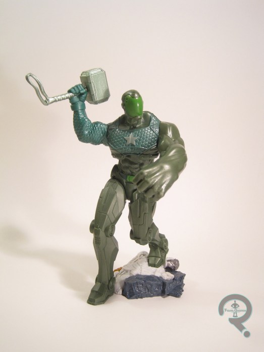 Ultron was another of the later additions to the Marvel Avengers Playmation line. This guy was a deluxe offering, so he’s a little larger in size than Super Adaptoid and the other basic-sized figures. The figure stands about 6 1/2 inches tall and he has joints at his neck, shoulders, and mid-torso. No hip movement for this guy, mostly due to both legs being affixed to the base. Like the Adaptoid, Ultron isn’t really based on one singular design from anywhere in particular. He’s probably the closest to the design Ultron had in the second season of Avengers: Earth’s Mightiest Heroes, which wasn’t too far removed from his classic design. As is fairly typical at this point, the head, and the antenna in particular, have changed in shape a bit. Also, he’s got tendrils now because of reasons I guess. Maybe he was jealous of Brainiac 13? The general quality of the sculpt is pretty good. I like the pose quite a bit, even if he did steal it from his son Vision’s first appearance cover. Nevertheless, it’s appropriately menacing. Ultron benefits from being mechanical in design, and thereby leaning into the curve of what this line was good at doing. Some of the details feel a bit on the soft side, but he’s about on par with the rest of there figures in that regard. The base piece is really the coolest part here, with a greatly battered Captain America shield, and even a little Mjolnir. It paints a nice picture of Ultron’s assumed defeat of the Avengers. In terms of paintwork, the base figure is mostly molded in a grey plastic, which is rather drab. The head is painted silver, in order to help facilitate the light-up head feature exhibited when this guy is used with the game. A lot of good that does me. The base is the highlight again, featuring a great bit of weathering on Cap’s Shield. Very cool.