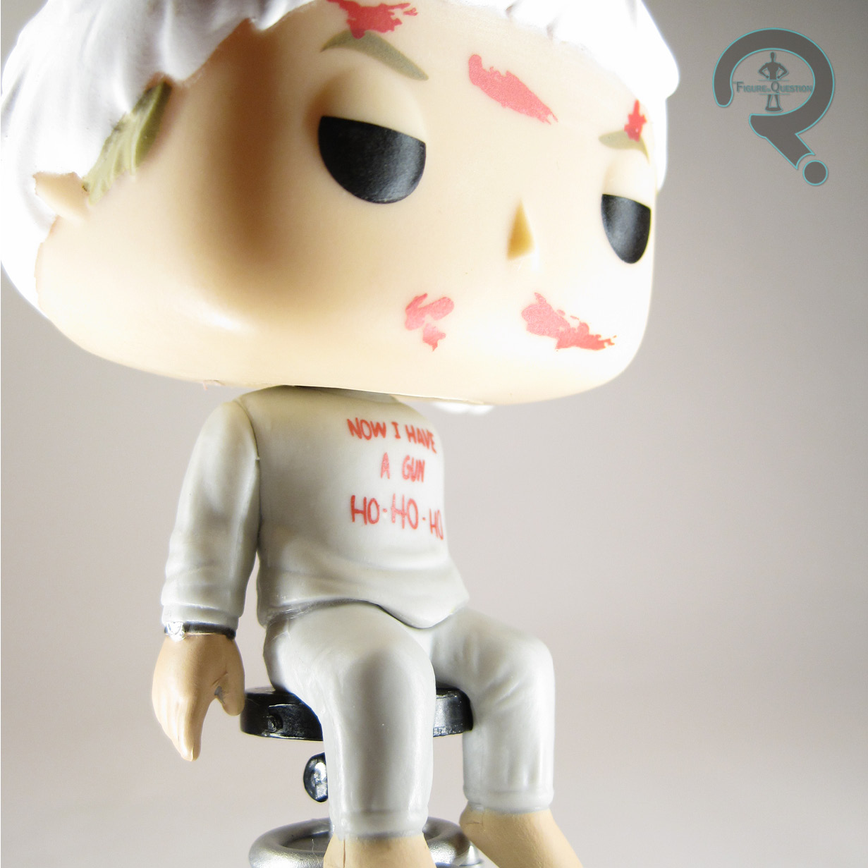 Tony Vreski is #671 in Funko’s Pop! Movies line, the fourth of the four Die Hard Pops. There’s something downright amusing about the fact that we got four Pops from the movie, and they were the three most major characters in the film…and Tony. This is also the only version of Tony we get, all corpsified and gross. Alas, there is not “generic blonde guy in grey sweats and grandma glasses” Tony out there. The figure is 3 3/4 inches tall and has the same single neck joint that all of the non-Marvel and Star Wars Pops get. For him, it’s not quite as useful, what with the being dead and all. He’s actually pretty stable for a modern Pop, thanks to being seated on his little rolling chair (which, sadly, doesn’t actually roll. I know, how sad), which I was certainly happy about, because I get a little tired of these things falling over all the time. It’s one of the more unique Pop sculpts, not by virtue of the outfit or anything, of course, but that pose is definitely not a common one, and does its best to sell the “this guy’s definitely dead” thing that’s sort of essential to a good Dead Tony figure. Although, I suppose it’s possible he’s just *really* out of it (no joke, when Super Awesome Wife first saw him, she asked if he was alright…I then had to tell her he *really* wasn’t, you know, cuz he was dead). Tony’s paintwork isn’t anything amazingly complex or anything, mostly being the grey sweats and all, but he does get the appropriate movie accurate blood smears on the face, as well as the half-way closed eyes. He also gets John’s “Now I Have a Machine Gun Ho-Ho-Ho” message, although it appears “Machine” was dropped from it for space. I guess the message is still more or less the same, and it’s not like the impact of the visual is lost too much, but it’s a little odd that they dropped that one word.