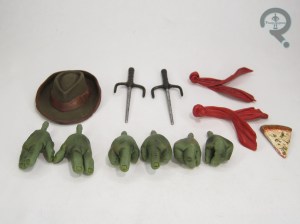 some doing (hence why I didn’t, what with already having one sans coat and all), but it’s possible. The coat is held in place a little more so by a sculpted back pack, which is a reasonable enough piece. The whole disguise is topped off by the hat, another sculpted plastic piece. It’s designed with a hole at the back, so that it can sit more properly on the head, while still allowing for the knot on the back of his mask to be left undeterred. It’s a little janky to look at from behind, but it does stay in place pretty nicely. In terms of accessories, Raph has the same alternate hands, alternate ties to the mask, slice of pizza, and sais as the single release, but also adds an extra set of hands which are pointing, you know, for pointing purposes.