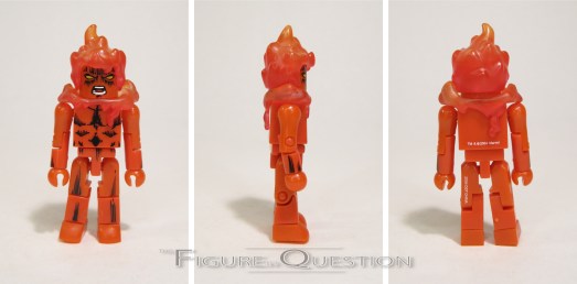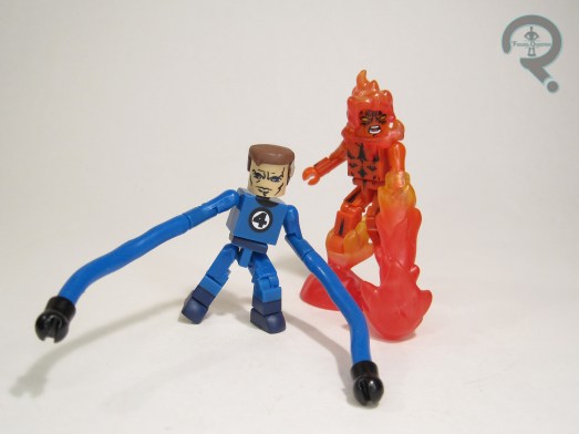 Also deviating from the standard gear, it’s Johnny Storm, depicted here in all his fully flamed-on glory. He matches Reed in terms of height and articulation, since he too is built on the basic updated body. He gets a replica of the original’s head. The original sculpt does its best to replicate the flamed-on look, which is tricky to get into three dimensions. Ultimately, the success is, I think, at best, spotty. But, that’s been the case for almost 50 years, so it is what it is. Johnny’s outfit is the simplest of the four, just a jumpsuit, not even a belt like the other three. Like Ben, Johnny’s outfit has a silk screened pattern to try to get his flame effects down, but I don’t think it works as well. It just sort of looks like shapes, not really fire. At the very least, the tried something different, which is better than not.