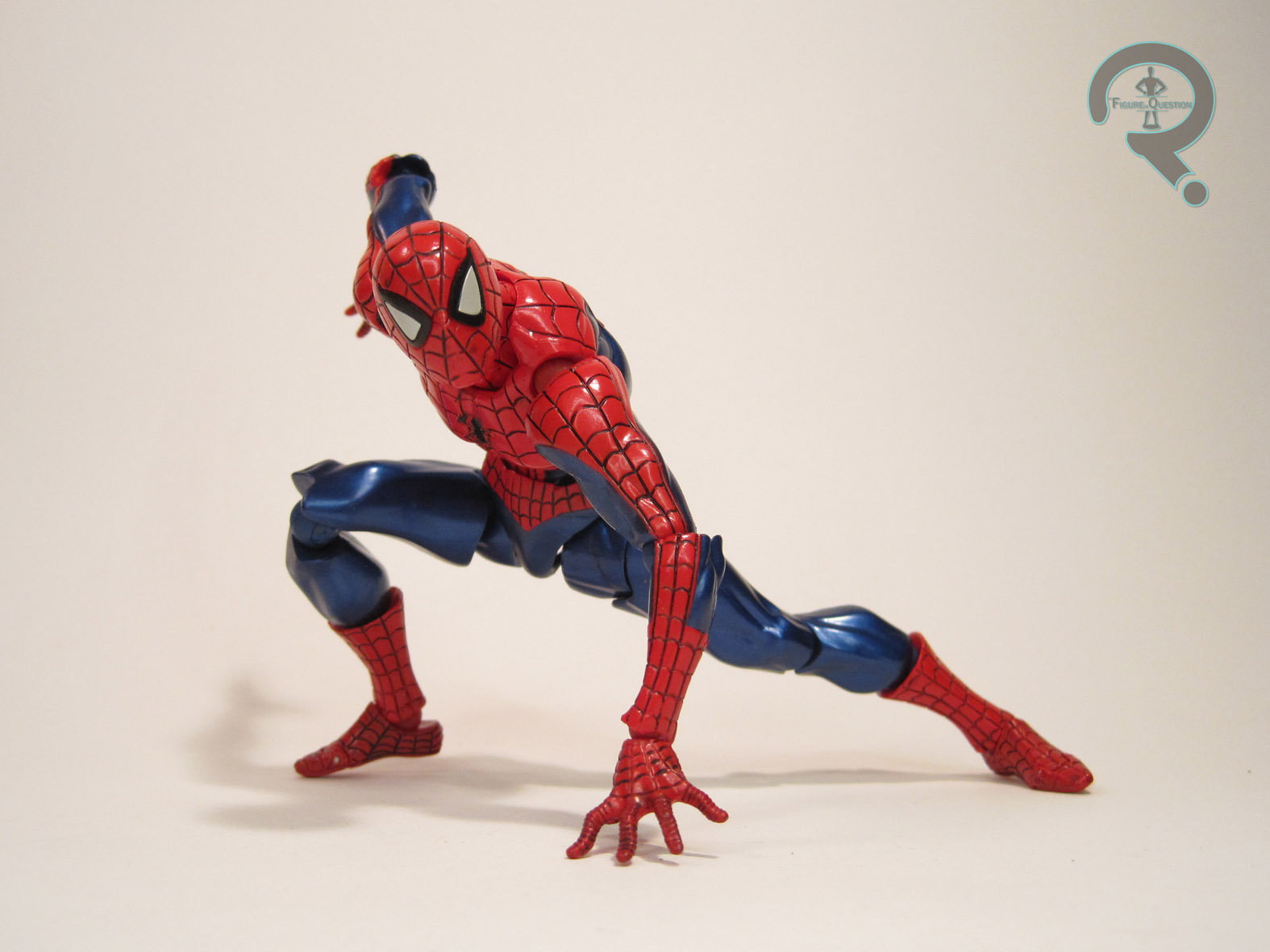 (the majority of them are Revoltech’s signature Revolver joints), to be sure, but how they interact and are used is slightly different that your typical action figure. Due to how the figure has been sculpted and how the Revolver joints are placed throughout the sculpt, you can’t really just pick this figure up and randomly pose him, the way you might with, say, a Marvel Legend. You have to know what pose you’re going for, and sort of reconfigure him into that set-up. In some ways, he’s a little more like a construction set that you can reassemble into different configurations. The end result is a figure that can get into and hold some pretty spectacular and very Spidey-esqe poses. He’s definitely dynamic. By nature of the figure’s design, his sculpt is, overall, rather unimpeded by the articulation, though he is rather segmented. Depending on how you have him posed, this segmentation isn’t as noticeable. He’s very sleek, and there’s no denying that this is a very good looking figure. His paint only adds to that. The blue is nice and metallic, and the red has a satisfying glossy sheen, which only furthers the very slick stylings of this guy. Accessories are another strong suit of this figure. He includes four different sets of hands, in fists, open palm, web-shooting, and gripping. The gripping hands don’t really have much practical use on this figure, but the