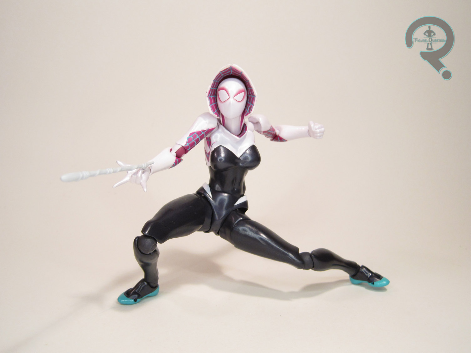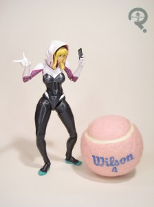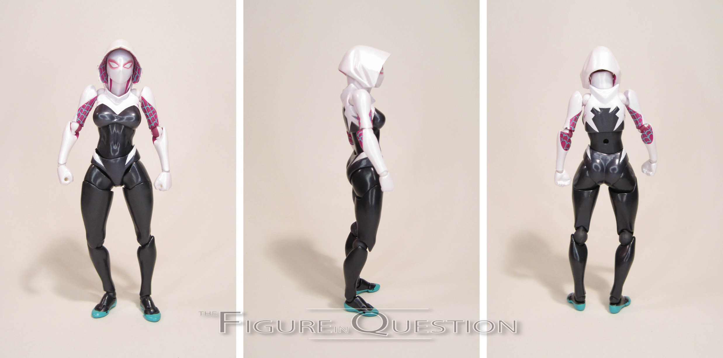 (again, not much different from the Legends figure) and she has 45 points of articulation. Unlike Peter, who has a bit of a learning curve attached to his articulation, Gwen’s actually fairly straight-forward. Her articulation is far more intuitive, a lot smoother, and the joints are more carefully placed. Where Spidey feels a little like the Revolver joints were added to a finished sculpt after the fact, Gwen definitely was sculpted with those joints in mind. This is most clearly illustrated in the two figure’s knees. On Spidey, the joints are set back behind the knee, and there’s this large flat gap that appears when the knee is bent. On Gwen, her knees *are* the joints, and they work like actual knees. No weird breaks in the sculpt necessary. On the flip side, however, Gwen’s multi-part hood construction doesn’t work quite as well as the multi-part head/neck that Peter has. For the most part you can make it look alright, but there are some angles where it just looks perpetually off. Still, its hinged design is somewhat inspired, and I can tell they were trying for something a little better than how the hood was attached for the Legend. There’s a bit more going on with Gwen’s paintwork than there was with Peter. It’s all very clean, and the slight gradient of the pink around the eyes is very impressive. There’s a slight bit of slop on the edges of the