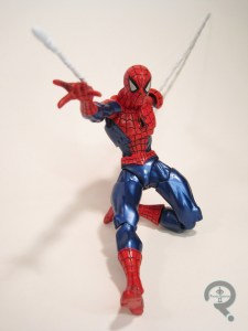 Spider-Man is, of course, no stranger to action figures. In fact he’s usually on the short list whenever anyone picks up the license. So, it’s not a shock that he was amongst Revoltech’s first two releases (supplanted only by fan-favorite Deadpool). This Spider-Man appears to take inspiration from J. Scott Campbell’s version of the wall-crawler, with a little bit of Humberto Ramos’ very expressive version thrown in, and it’s all filtered through Revoltech’s usual style. The point is, he’s definitely a very stylized figure, designed to fit specifically with the rest of Revoltech’s Marvel figures. The figure stands 6 1/4 inches tall (just a little shorter than Hasbro’s Pizza Spidey) and he has 43 points of articulation…theoretically. He’s got a lot of joints