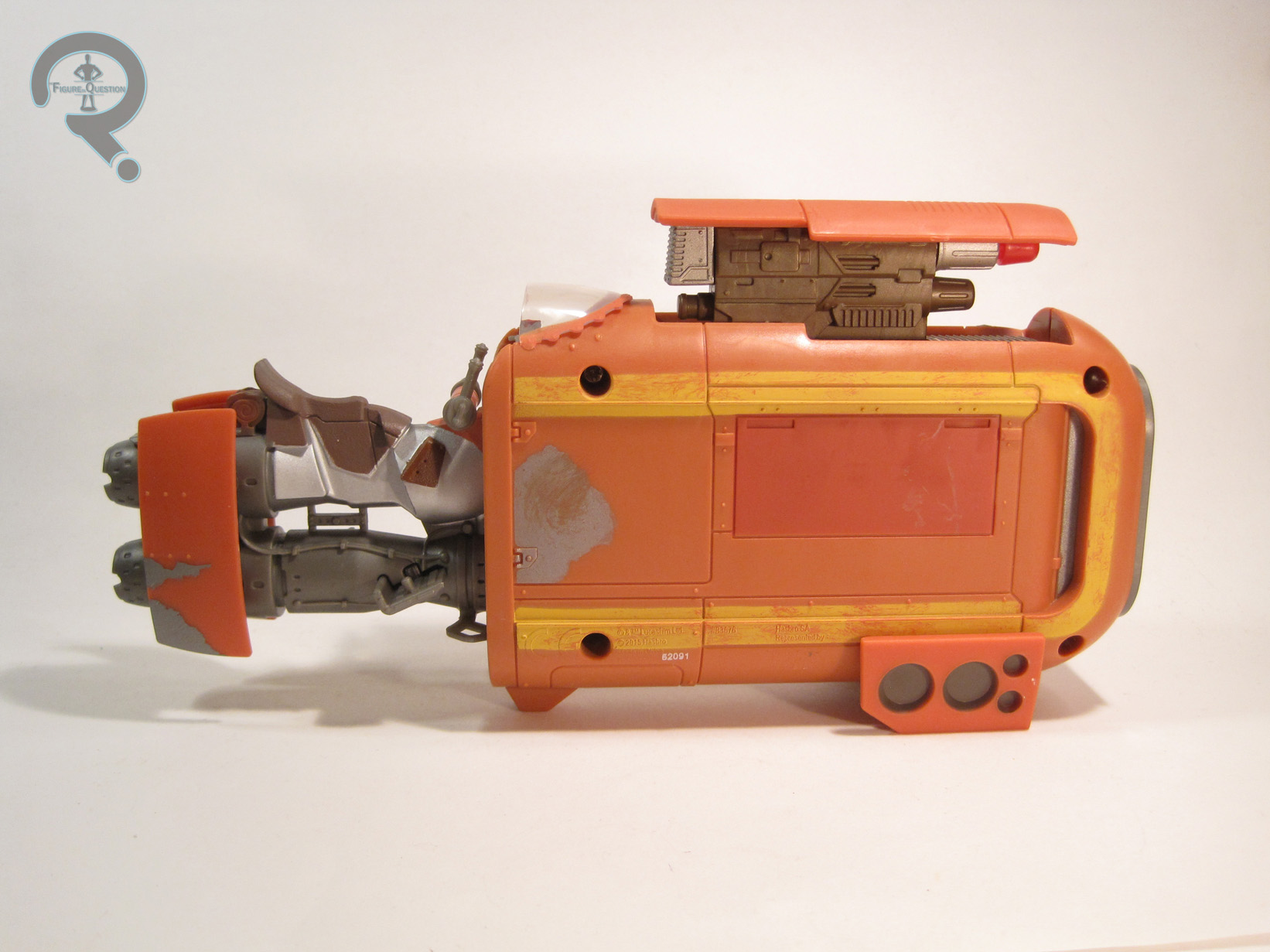 Rey stands tall at about 11 inches with 22 points of articulation, though I have to note that one of those points is in her waist joint that has slight restricted motion. I feel it safe to say that most of her parts are unique to this figure, the only thing I think she might share is her head sculpt with the other Rey figure in the line. Her pants and linen tunic are the only pieces of clothing that are actually apart of the figure’s mold. The rest of the outfit is made of either cloth, for the jacket and arm sleeves, or rubber, for her gun holster, the bottom of her tunic, and shoes. The hair style is still her signature triple bun, which I still can’t replicate for myself, made with realistic hair that is tied with like colored rubber bands. Most of the hair in the buns and hanging loose are stiff to try and keep the hair all together, though my figure still got some hair pulled out from the style. Her tunic has a nice rough texture to stimulate the roughness of the material, and the bottom part is made of flexible rubber to allow the legs some free movement. Also, if you look closely enough you can see some slight creases in the top part of the tunic to indicate folds. Her jacket is made of a weird, smooth cloth material that is stitched together in some places and looks to have the jacket’s detailing printed onto the material. The end of the jacket is a little moldable, so that you can give the bottom of it a slight flare if need be. Her arm sleeves are made of two different cloth materials; the top is a striped gauzy fabric that is sown to and disappears under the second material which is the same as the jacket, including different printed designs. Rey’s pants are all plastic with simulated folds and texture in the mold and crafted knee/shin pads. Lastly, her shoes are made of a similar rubber as her gun holster, a different color of course, with texture and boot straps included in the mold. Her shoes aren’t fully attached to the figure, and they kind of remind me of a larger, rougher, and harder version of the little Polly Pocket boots.