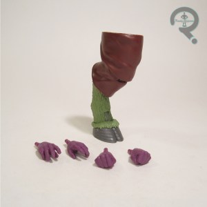 new head, forearms, shins, and add-ons for the belt and the wraps on the thigh. He also re-uses the cape from Hobgoblin. The whole thing is a pretty solid set-up. I particularly like the head sculpt; that alien quality really sells it. Sleepwalker’s color work is pretty simple for the most part, with the vast majority of the colors being molded. Really, the only paint is on the head, and that works pretty nicely. Otherwise, he’s fairly bright and eye-catching, in proper early ’90s fashion. Sleepwalker is packed with two sets of hands (fists and open gesture), and the right leg of the Rintrah Build-A-Figure.