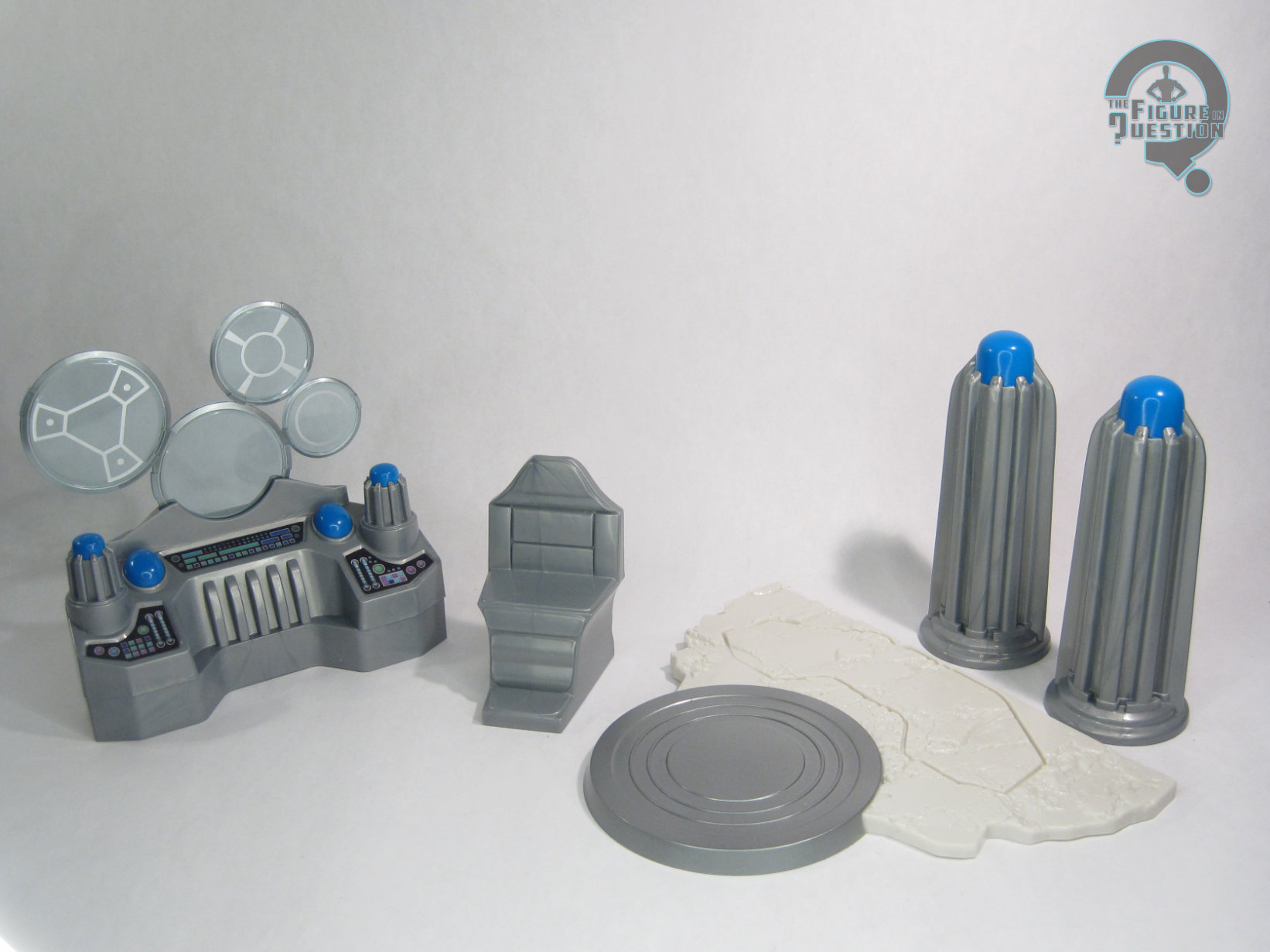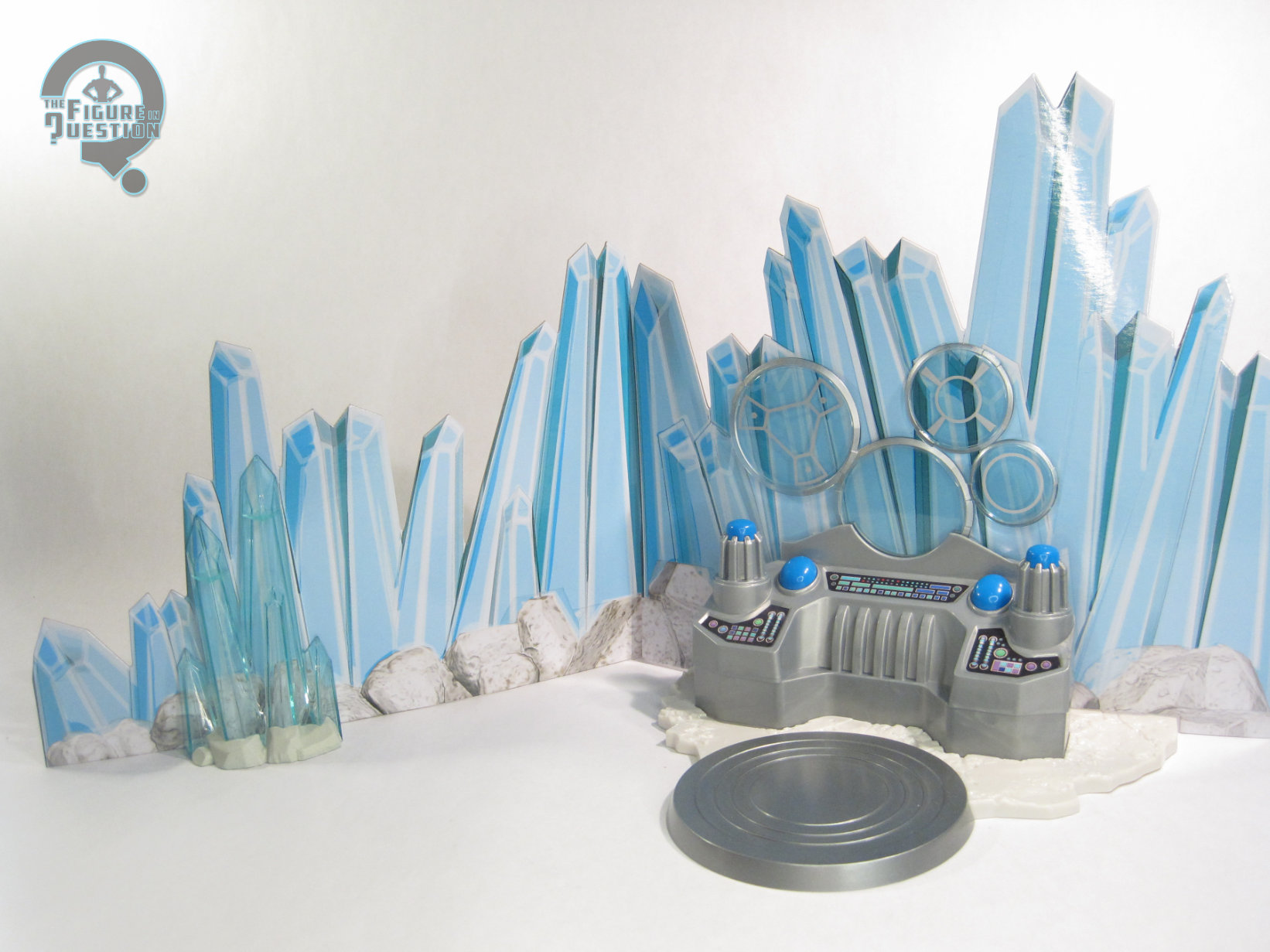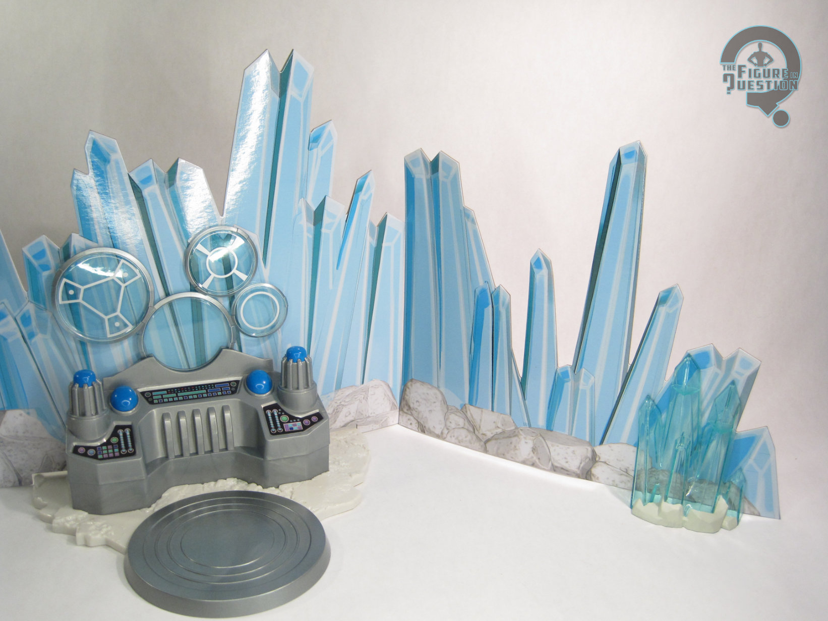 mixed in. While the bulk of the crystalline structure is just cardboard, a surprising amount of the rest of it’s sculpted. The whole central console, the base it plugs into, the chair, the two free-standing columns, and the two end crystals are all plastic. The central console is certainly the coolest part of the whole thing, with is various buttons and screens all detailed. The chair just sort of sits there, not actually attached, but I suppose that gives you a little more variety in how exactly you set it all up? There’s nothing gimmicky or particularly play-related about the set, though. It’s really just a large display for your figures, but it does that well enough.