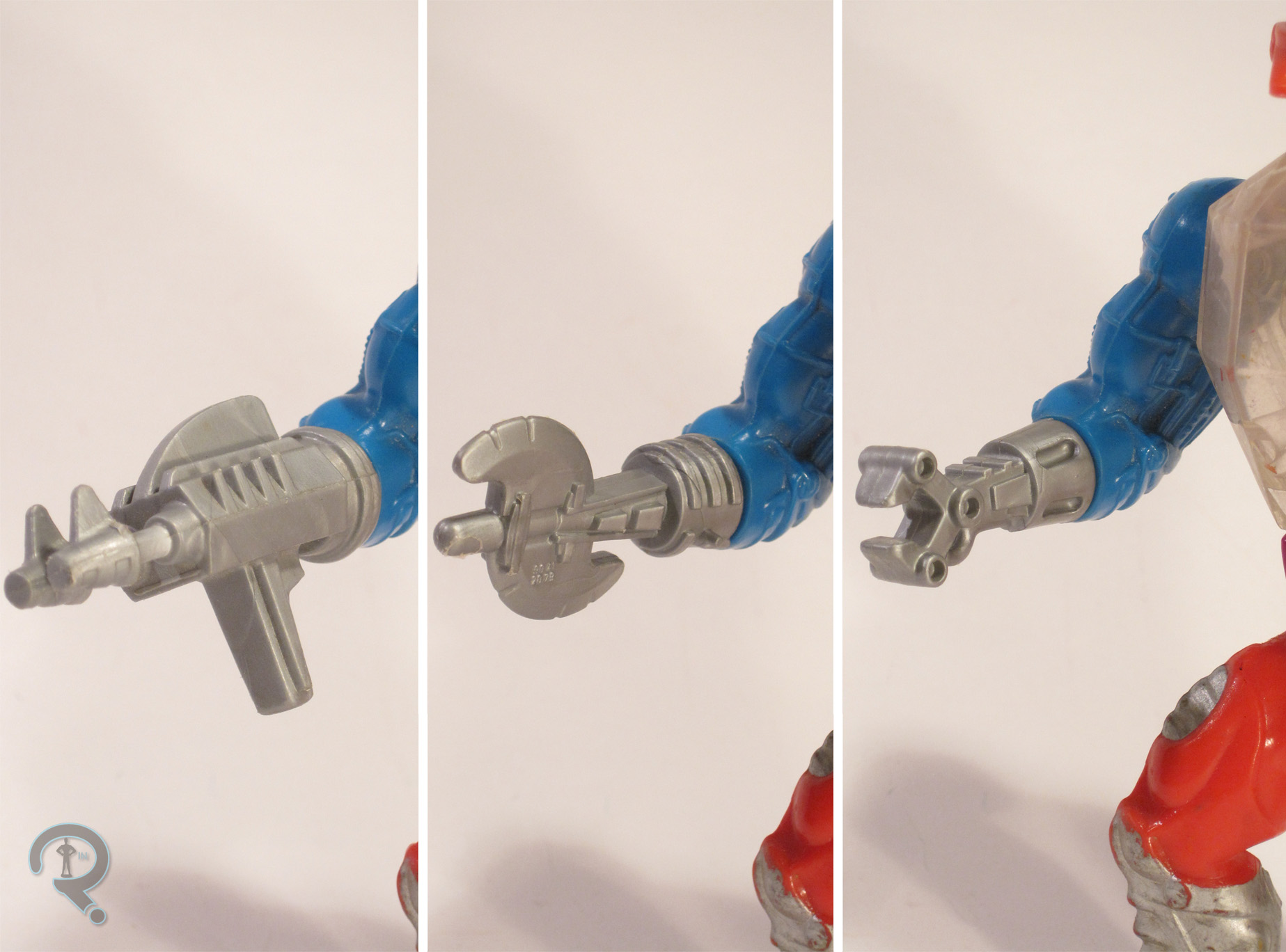 are very cleanly detailed, and I love the working jaw and turning gears inside the torso. I also really dig the little heart sculpted around the central gear, in reference to his mini comic appearance. The arms are fine, but the elbows are notably rather restricted in their motion, which was a recurring issue for the line. QC was unfortunately a notable issue for this guy. Thankfully, mine isn’t plagued by the torso cracking, but there was no avoiding the reversed shoulders. They aren’t the end of the world, but it’s pretty obvious they’re not the way they’re supposed to be. The color work was actually pretty nice for this guy; he’s really bright and bold, so it makes him very eye-catching. He’s also got a wash on the silver sections, to help bring out the sculpted details a little better. Roboto was packed with his classic claw, axe, and blaster attachments, as well as a standard hand. The weapons are a bit soft and prone to warping, but generally they look okay, and the standard hand is a nice addition.