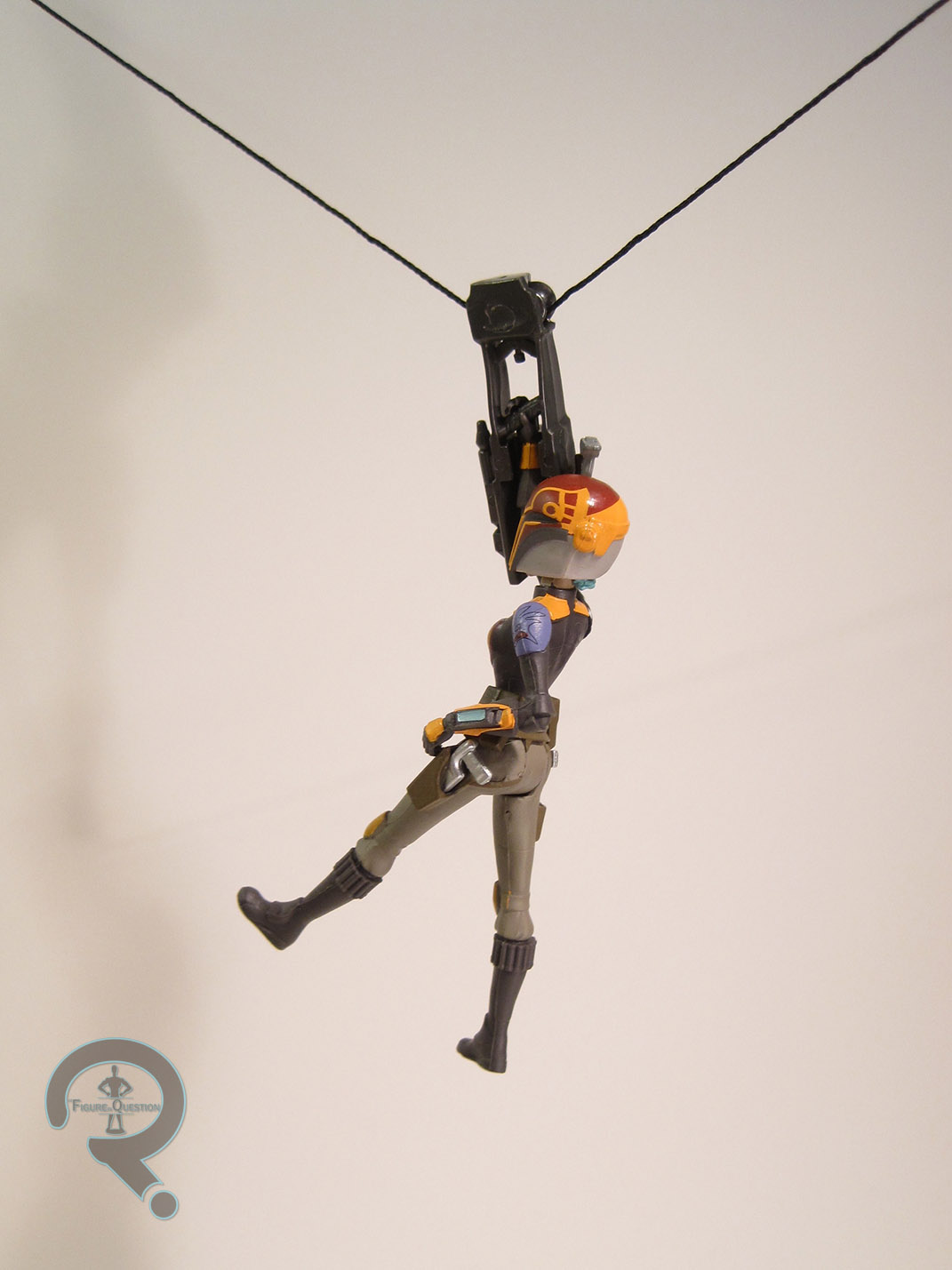 works pretty well. Her head’s a touch smaller to accommodate it, which is in keeping with the style of the older figures, and the helmet’s a touch larger. It’s a good look, and the helmet stays in place snuggly. Her paint work is pretty respectably handled. There’s a good mix of colors and accenting, making for some fun pops of color. Sabine is packed with two blaster pistols. They’re in different colors, an exaggeration of the slight tweak in detailing on the blasters in the show. She’s also got a lightsaber, which continues the Bespin Luke style of saber.