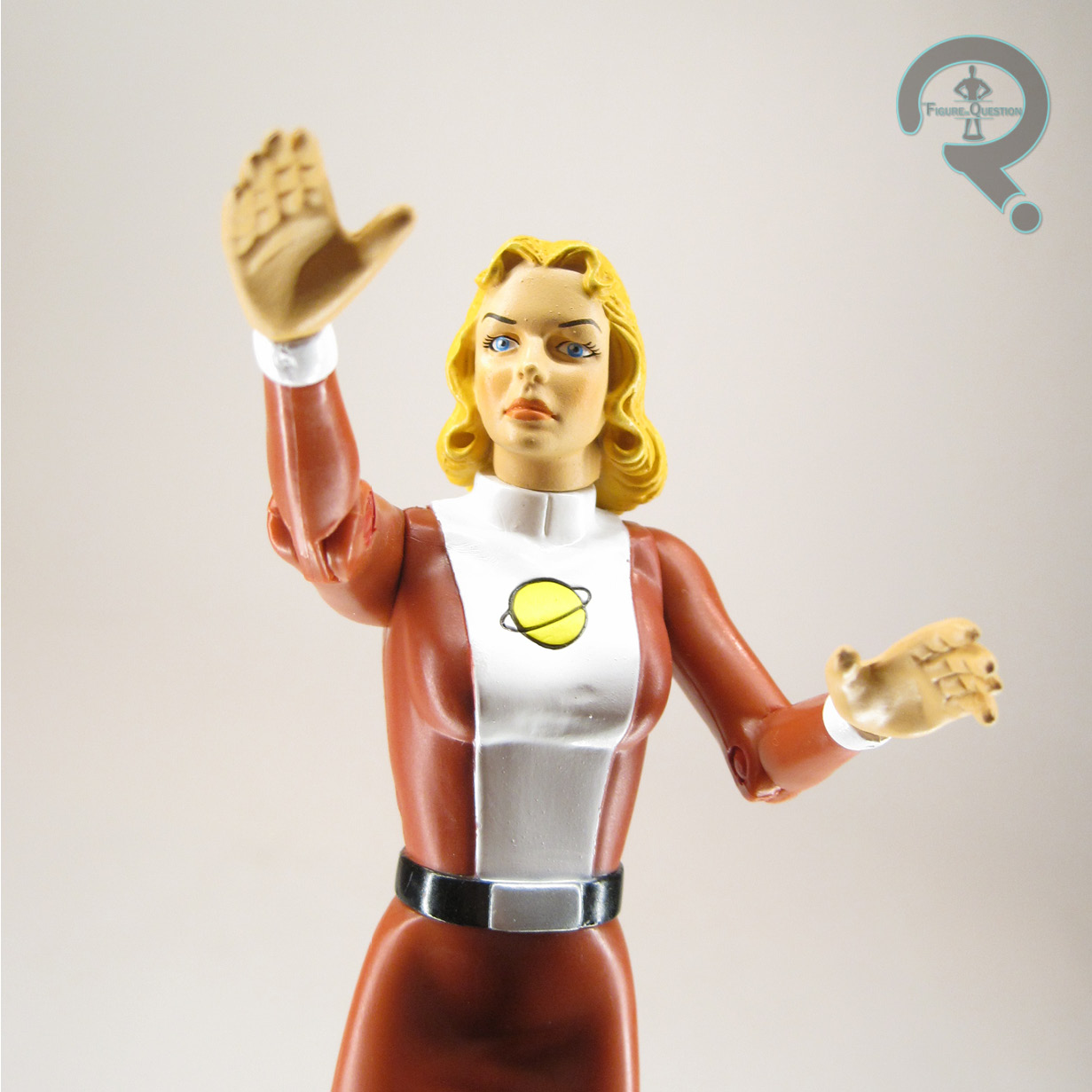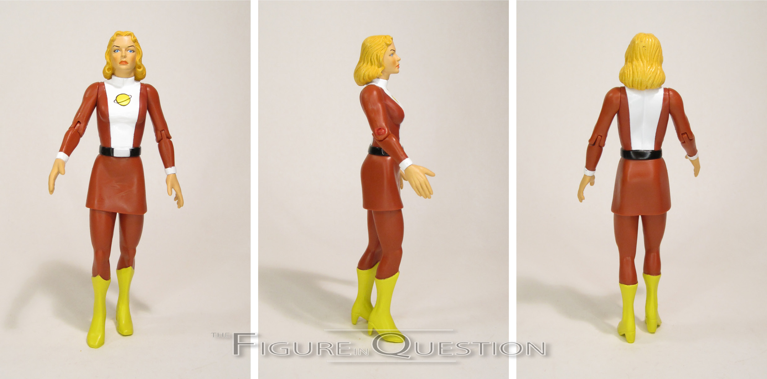 Saturn Girl was released in the inaugural series of DCD’s Legion of Super Heroes line in 2001, alongside fellow founders Lightning Lad and Cosmic Boy. All three were based on their classic Silver Age designs, which seems appropriate for their very first figures. Saturn Girl stands 6 inches tall and has 8 points of articulation. Articulation on DCD figures was never really standardized, and the Legion figures exemplified that. Though Irma gets reasonable articulation for her arms, there are no joints below her waist. This wouldn’t be such a terrible thing, if not for the fact that the figure’s legs aren’t *quite* molded in the right position to let her stand flatly, meaning she pretty much can’t stand on her own (the turnaround shots below were nothing short of a miracle, I assure you). On the plus side, her sculpt is at least a rather nice one. It’s nothing amazing, but it’s definitely got a nice clean feel about it, and it manages to make her look rather attractive, without having to give her any truly crazy proportions or anything. The hands do seem maybe a touch on the large side, but otherwise she’s a pretty nice rendition of Saturn Girl’s ’60s design. The paint work on this figure is fairly basic overall, but the application is all nice and clean, and I quite like the slight bit of accenting on the face to help give her a little color. I also just really like how clean the painted flesh tone looks on these earlier figures. Saturn Girl included a stand (which, though helpful, still doesn’t keep her standing as well as you’d hope), a Legion flight belt for her to wear, and a life-size Legion flight ring for the collector to wear. Please note: flight right does not allow wearer to fly.