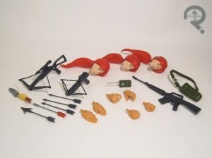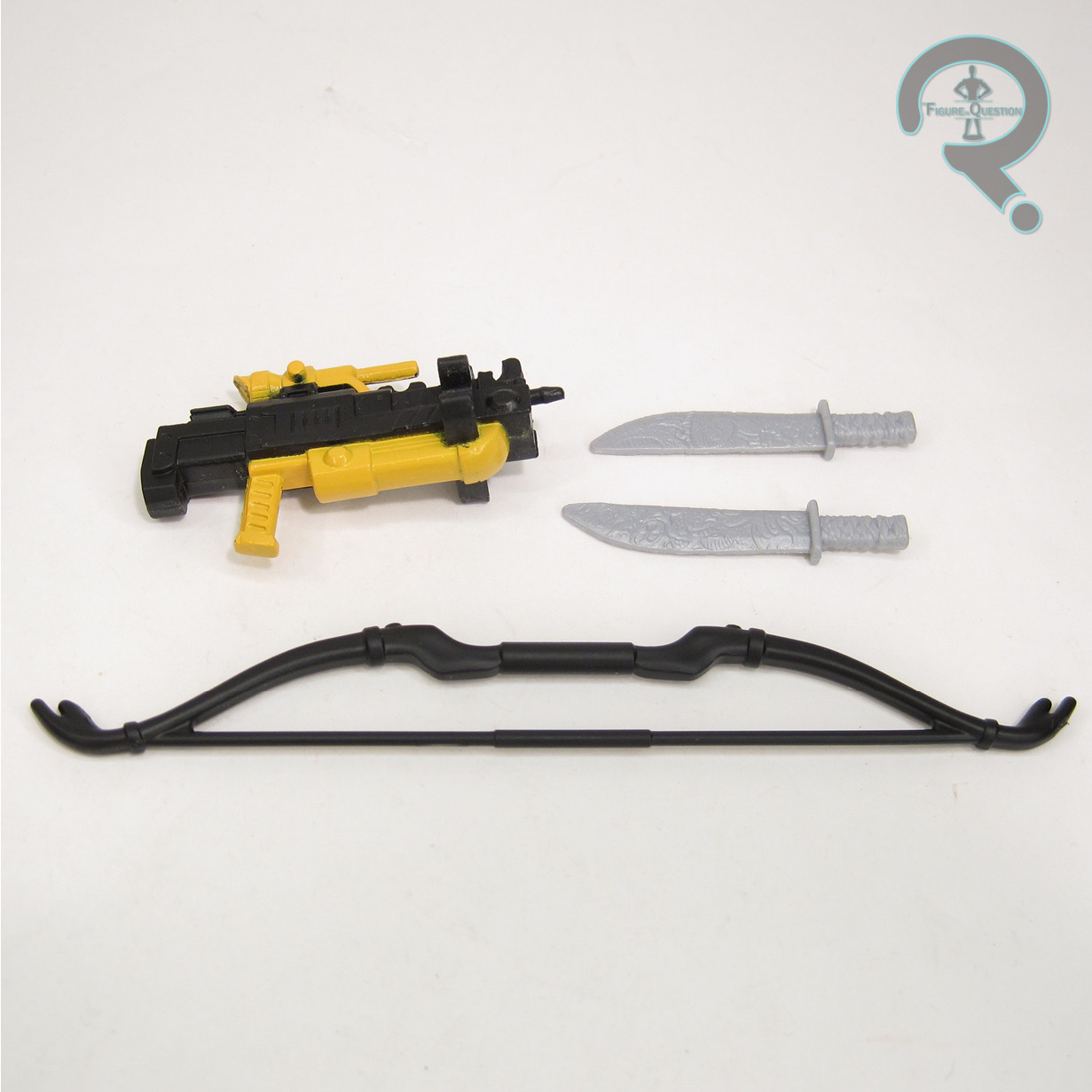 Stalker was another piece of the “fill in the set” puzzle, clearly being chosen because he could easily be built without investing in a ton of new pieces. Stalker himself has a relatively minor role, with Roadblock getting most of the focus in their section. The figure stands 4 inches tall and he had 22 points of articulation. Stalker is again pretty big on the re-use. He takes the Duke legs, and throws the Snake Eyes torso and arms in with it. It’s not the oddest choice, since Stalker and Snake Eyes have more than once shared parts. He gets a new head and webgear, and a collar piece he shares with Beachhead. The end result is an okay recreation of his on-screen design, though I’m not sure it works quite as well as Flint. The sweater collar on the skintight shirt looks weird, he’s missing the pockets on his shoulders. He’s also got gloves, which he didn’t in the show. At the very least, the new head (which I looked at when it was re-used on the 30th figure) is a pretty good piece. It’s certainly a unique look for the character. Stalker’s paint is alright, but suffers from the same lack of paint on the gun that Flint did. They also painted his skin tone too far down his neck on the back, meaning it runs past the separate collar piece. Since it’s on his back and obscured by two add-ons, it’s easy enough not to focus on, but it does look kinda goofy. Stalker includes Duke’s rifle in green and silver, a pistol, a knife, and a display stand.
