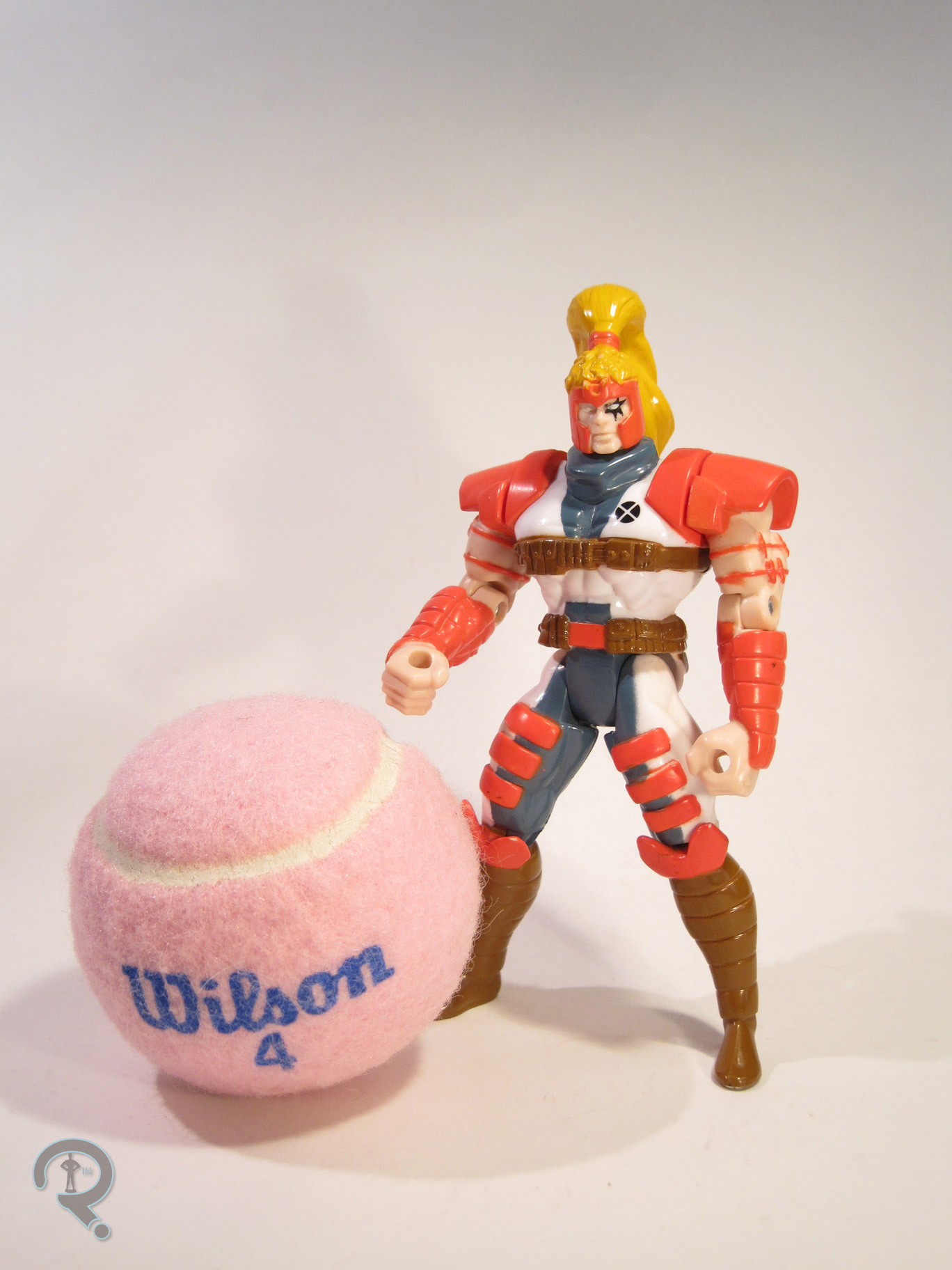 Shatterstar here was released as part of Series 3 of ToyBiz’s X-Force, which, like the comic, was a spin-off of the X-Men line. As the name denotes, this is the second figure of Shatterstar that the line offered. Shatterstar stands roughly 5 inches tall and features 9 points of articulation. This figure is actually based on Greg Capullo’s redesign of the character following Liefeld’s departure from the series. It’s…a little better? It’s more symmetrical, that’s for sure. That being said, he’s still got many of the 90s trademarks. He’s got pouches, shoulder pads, pouches, some weird headband thing, pouches, and that funky sunburst tattoo over just the one eye. Though, I guess you need some of that 90s flare to recognize it as Shatterstar, right? It should also be noted that Shatterstar also appears to have been doing a bit of juicing since his first figure. He looks…I don’t want to say puffy… but, yeah. He’s gotta be at least twice the size of the previous Shatterstar figure. Now, to be fair, that figure did seem a little emaciated, but this one seems to have gone a bit too far the other way. It’s not completely off the mark for Capullo’s rendition of the character, but the size feels a little bit laughable. That being said, the figure has a sculpt that is up to the standards of other ToyBiz Marvel stuff of the time. The details are nice and clean (which is certainly better that the comics) and the figure does a pretty good job of translating the comics design to three dimensions. The paintwork on Shatterstar is generally pretty clean. There’s some bleed over here and there, but nothing too noticeable. The colors are nice and bright, which is always a plus. Shatterstar included a pair of his trademark (and oh so silly looking) twin-bladed swords. Sadly, my figure doesn’t have them. He does, however, still have his action feature. His arms can be raised and locked into place, and then released by pressing the button on his pack, resulting in a slashing effect of sorts. So there!