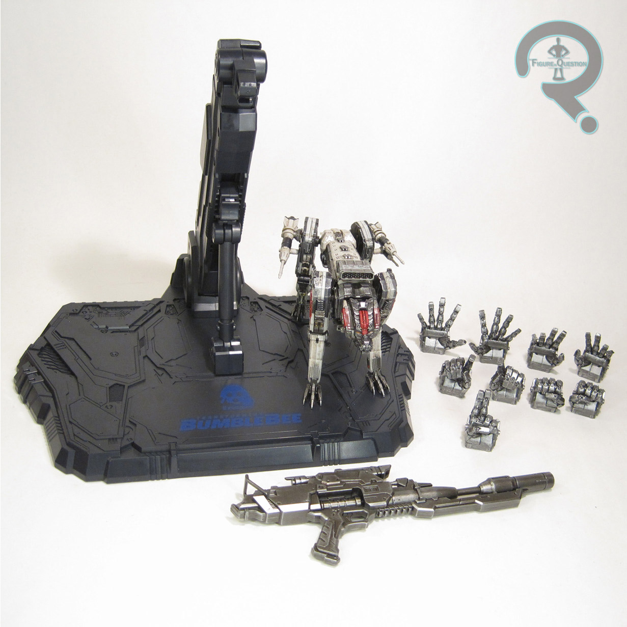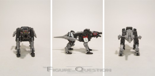 up a bit better with each other, so no mixes of yellow and gold, and the greys and silvers are also a little closer in finish this time. It results in a slightly punchier look. The real test, of course, is whether this one will face the same discoloring issues as the last one. Like the last release (and the Siege release as well), he gets his two cannons and folding gun, and to justify the Leader class price point, he also adds in three cassette buddies: Ravage, Buzzsaw, and Frenzy Rumble. Ravage is once more using the Siege mold, with a deco that matches the WFC pack-in,
