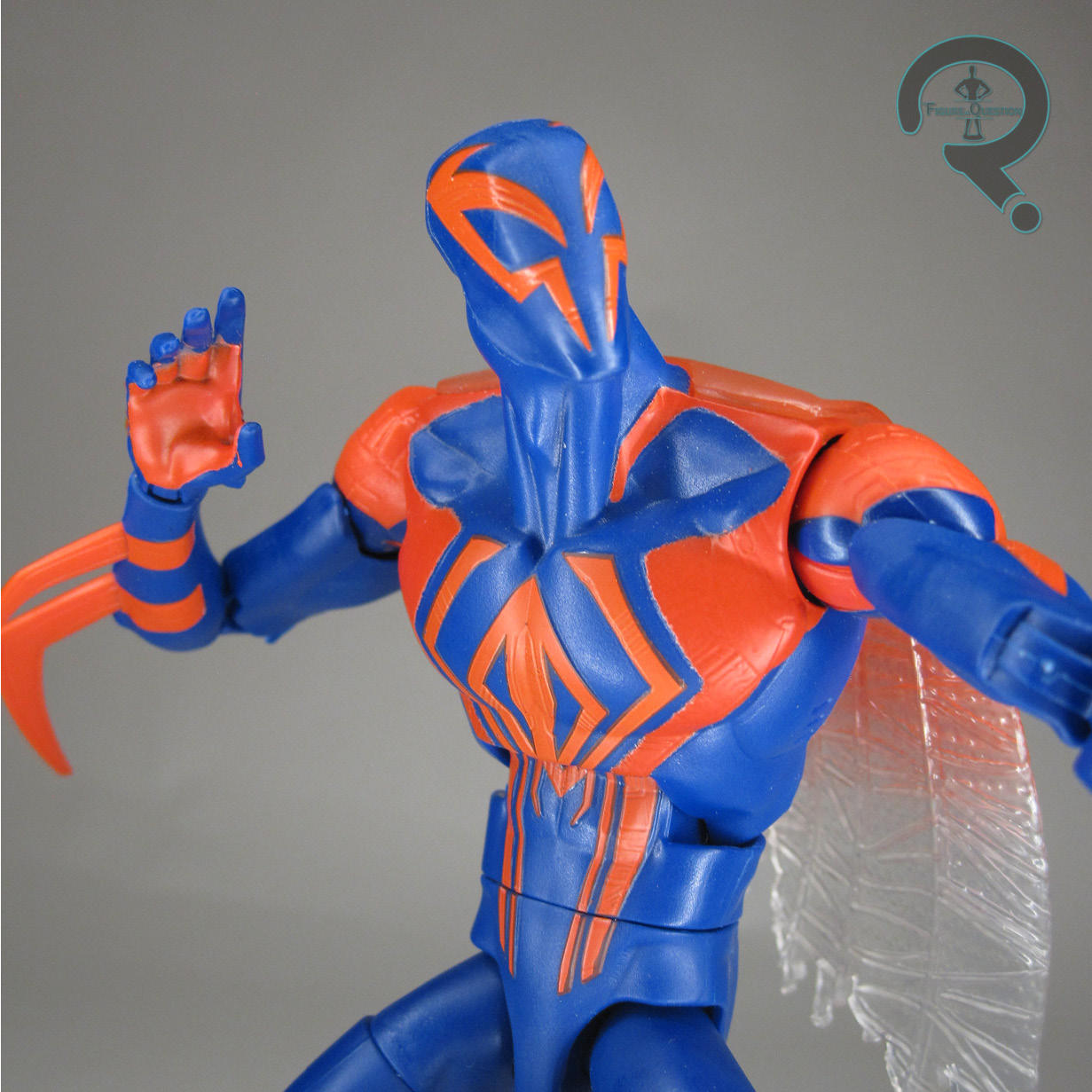 sculpt. It’s a good recreation of the film design, with strong proportions and pretty sharp detailing. The back has been retooled so as to remove the cape and where it was mounted, since he spends a lot of time without it in the movie. He also get the cross-dimensional goober like Punk, Gwen, and Pavitr, though this one is obviously larger to fit his larger stature. His color work is slightly tweaked as well, with the blue being darker this time, making the contrast on the costume a little punchier. Otherwise, the paint masks look to be the same, and he still looks fine. 2099 gets the same sets of hands as the last release, as well as a new unmasked head sculpt, which is a good match for the source material, and gets some solid paint work.