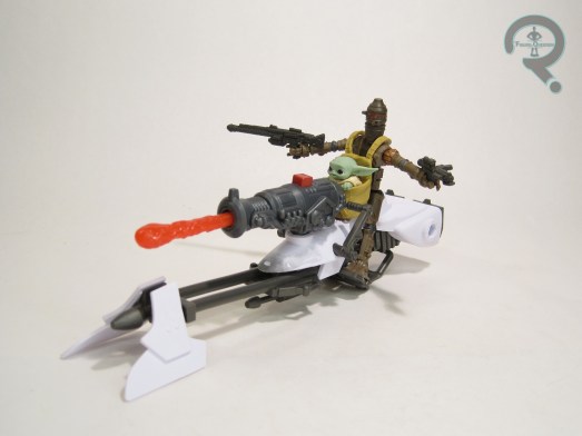 such worked in. The design is a little stubborn in figure form in a few spots, especially on the shoulders, I found. That said, I do think it’s generally a nice piece, and I was impressed by how the removable helmet worked out in particular. Given Hunter’s longer hair, I was expecting it to be a much tighter fit, and for the helmet to end up making him look a lot more bobble-headed than it does. I think I do still slightly prefer him un-helmeted, but both ways work out alright. Hunter’s paint work isn’t bad, but it’s a bit of a mix, really. The underlying face has the printing technique, which looks good, and the customized look on his helmet is impressive, but it does feel like he’d be a little more impressive with some additional accenting to bring out the sculpted details. As it is, it still looks okay, but it could be better. Hunter is packed with his customized larger blaster, as well as one of the standard smaller blasters, a knife, and a back pack. It’s a shame that there’s no storage for either blaster, but it’s a minor complaint. Getting extras is always cool.