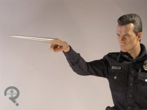 “Specs: Model T-800 {Final Battle} – After escaping Cyberdyne, the T-800, Sarah and John Connor are pursued by the T-1000 into a steel mill. The Terminators engage in violent hand to hand combat causing the T-800 to sustain critical damage. Now missing his left arm and operating on limited power and capacity the T-800 staggers to Sarah and John’s rescue and fires his last grenade into the T-1000 causing it to explode and fall into a vat of molten steel.”