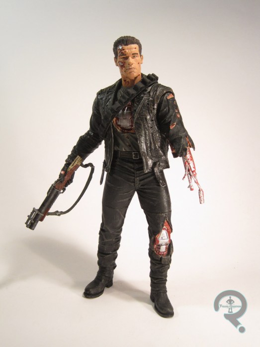T800Ult2aThe Ultimate T-800 was a single release, who started hitting stores last month, which, coincidentally, was the same time as the Terminator Genisys figures. The figure stands a little over 7 inches tall and has 26 points of articulation. That’s a whole 8 points more than his original release brethren. By design, the large portion of this figure’s tooling is shared with the prior T-800 figures. This isn’t a bad thing by any stretch of the imagination, of course, since the detailing on those older figures was pretty darn good. The jacket is wonderfully textured, and even has the bullet holes from where the T-800 shielded John from the T-1000. The gloved hands are also very well textured, and hold all of the included weapons pretty well. And then there are the heads. Three different heads are included: clean with sunglasses, clean without sunglasses, and fully battle-damaged. All three heads feature a very good rendition of Arnold’s likeness, but the sunglass-ed head absolutely nails it, and is my favorite by far. It’s just got the look down. The damaged head is a nice enough sculpt, but it’s a little jarring to see the fully damaged head on a completely intact body. I kind of wonder if the partially damaged head might have been a better fit here. Enough about the old pieces, what about the new pieces? Well, essentially the entire lower half is new.  I think the boots may be reused, but that’s it. The joints on the legs are a little stiff at first, but once you get them moving, they make a pretty big difference. They also match up really well with the pre-existing parts, so you’d be hard pressed to find evidence that they weren’t sculpted at the same time if you weren’t already aware. If there’s one area that this figure could stand to improve, it’s paint. To be fair, T800Ult5with the exception of a single one-of-a-kind issue that is quite glaring, the paint on this figure is actually pretty decent. The paint on the clothing is great, and it does a nice job accenting the texture of the sculpt. The grey shirt isn’t technically accurate with the sunglass-ed head, but that’s a really minor thing. The sunglass-ed and damaged heads are a touch messy, but nothing exceedingly bad; just a few missed spots here and there. What throws the whole figure off is the normal head’s eyebrows, which are just badly misplaced, throwing the whole thing off. It’s totally limited to my figure, and to NECA’s credit, their CS is already working to get me a replacement (at which point I’ll re-shoot that one shot with the messed up head), but it definitely renders the head useless for the time being. Fortunately, there are those other two heads to let me still enjoy my figure as much as possible! In addition to the extra heads, the T-800 also includes a shotgun, a handgun, a grenade launcher, a bandolier, and (my favorite) his minigun from the Cyberdyne scene. All of these are done with incredible accuracy, and it’s a great assortment of parts in general, though I wouldn’t have minded getting a set of ungloved hands to go with the shotgun.