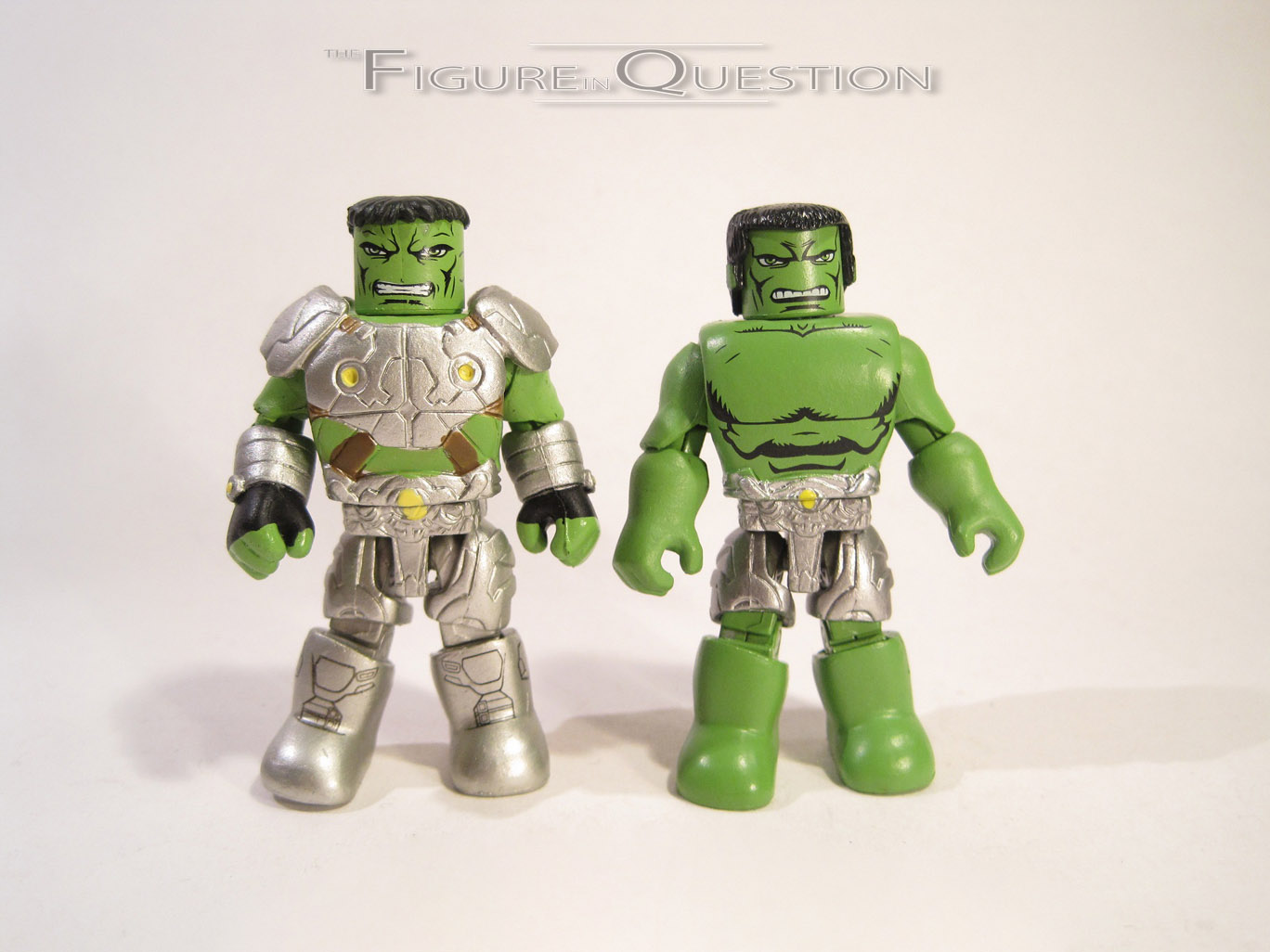 Hulk here is a bit less space-ready than the Cap figure. As the name implies, he’s just an armored version of the character. The figure is over 2 ½ inches tall, closer to the 3 inch mark, and he features 12 points of articulation. He’s based on the character’s Now! look. This is the second Minimate based on the look, but the first one was more armor-lite. This is what the character’s looked like for most of the Now! run. The figure is built on the basic Minimate body, with non-standard pieces for the hands and feet, as well as add-ons for the hair, torso, upper arms, waist, torso extender, and upper legs. The hair and upper arms first cropped up on the Series 41 Mega Rage Hulk, the feet first appeared on TRU’s Hulk as Nul, the hands are from the Hulk TTA Maestro, and the torso extender, waist cover, and upper legs are from the TRU 16 Now! Hulk. The chest piece is the only truly new part, however it’s nicely handled. The reused