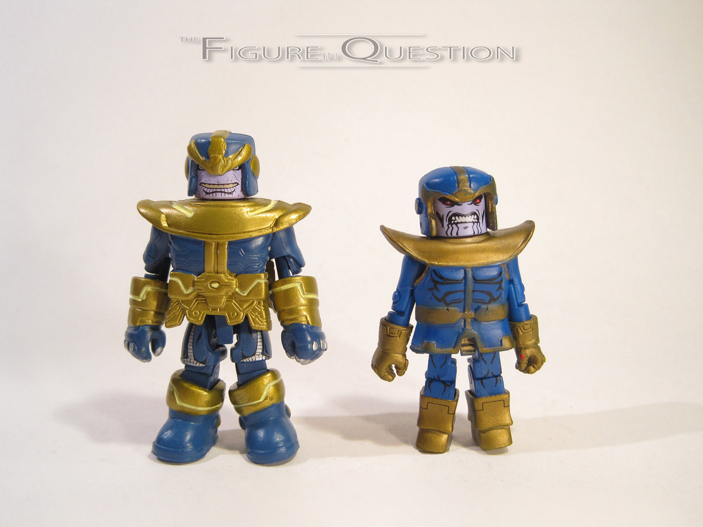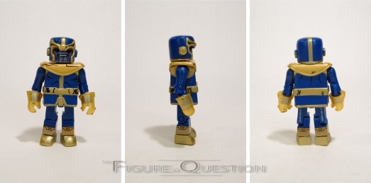 Thanos here is probably the biggest draw of this set. This is the third version of Thanos in the Marvel Minimates line, but it’s been five years since his last figure. If you’re a faithful follower of my reviews, you’ll recall I didn’t think the last one was very good. Plus, he’s set to be a major player in the Marvel Cinematic Universe in the next few years, so it’s really good timing. Thanos is the largest ‘mate in the set, coming in at just shy of 3 inches tall, and he has 12 points of articulation. He’s based on Thanos’s recent redesign from Infinity. It’s not far off from his original design, but there are a few differences in the execution of some of the details. Thanos uses the basic Minimate body as a starting point, with non-standard hands and feet, as well as add-ons for his helmet, torso, upper arms, waist, torso extender, and upper legs. The upper arms and legs are from the Series 41 Hulk, the extender is from the TRU 16 Hulk, and the waist cover is from a whole bunch of Minimates (I’m not sure who used it first). The helmet, torso cover, hands, and feet are new to Thanos, and they’re pretty good overall. The torso is probably the best piece. It has a lot of ornate detail work that looks really good. The hands and feet are decent, though they seem a little too rounded. The helmet is good in theory, but not quite in practice. It’s well sculpted, but it sits too low on the head, which obscures a lot of the details on the face. Thanos’s