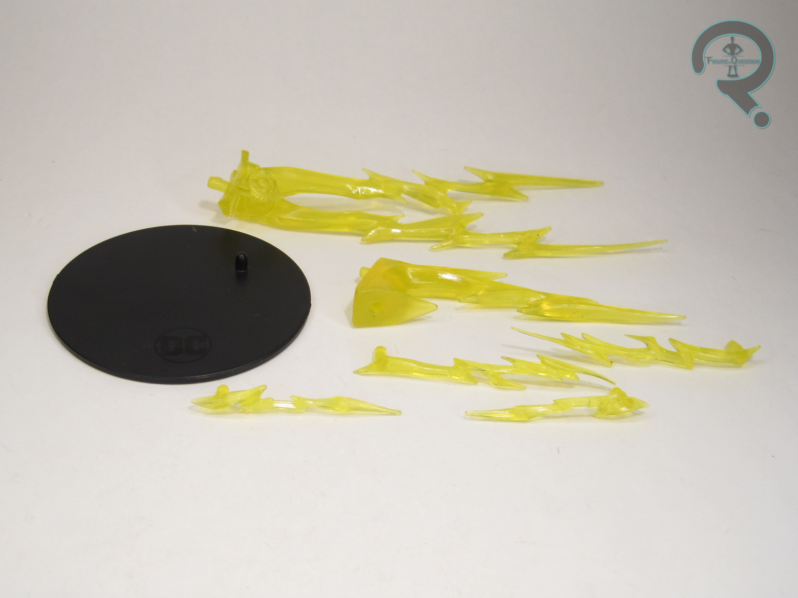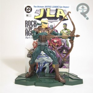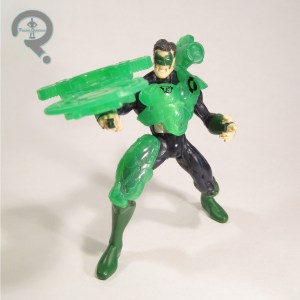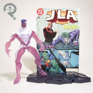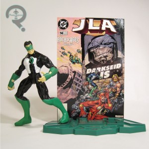 who’s got a pretty angry look about him. Presumably, he just found his girlfriend in the refrigerator. Shame. It’s a sculpt that I don’t think anyone can quantify as “good,” but it sure does do…something. Look, it’s very memorable. In terms of color scheme, Kyle’s original Total Justice figure was pretty subdued on his colors, with the greens a little on the darker side, the black more of a dark blue, and the white a sort of pearlescent shade. For JLA, which tended to aim darker, they actually punched it up a bit. The white and black are much starker, and the green is just a tad lighter. During Total Justice, GL got some of the line’s crazy Fractal Armor, but in his case it was done up in translucent green plastic, so it looks like a construct, which seems less silly. For JLA, he got a green stand and a backer with JLA #14 on it. He’s one of the three Leaguers on the cover, so it works well enough.