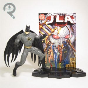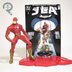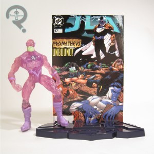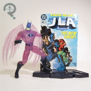 of 5 inches tall. Flash has the standard 5 points of articulation, while Batman also gets the sliding glider wings of the TJ mold. I’ve looked at both of these molds previously here and here. They’re very much products of their time. To sell them as the holograms that they are, both figures are molded in translucent plastic, with a big emphasis on purple hues, which honestly is a pretty fun and unique look. They come with JLA logo stands, both in a dark purple, as well as their own backer cards. Batman gets #16 and Flash gets #17, neither of which features these two, either on the cover or in their contents. Also, #16 has Huntress, so, like, maybe that one should have gone to her? I don’t know, I’m just spit-balling here.