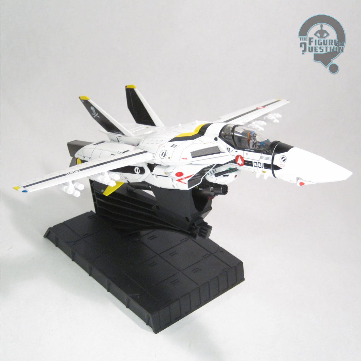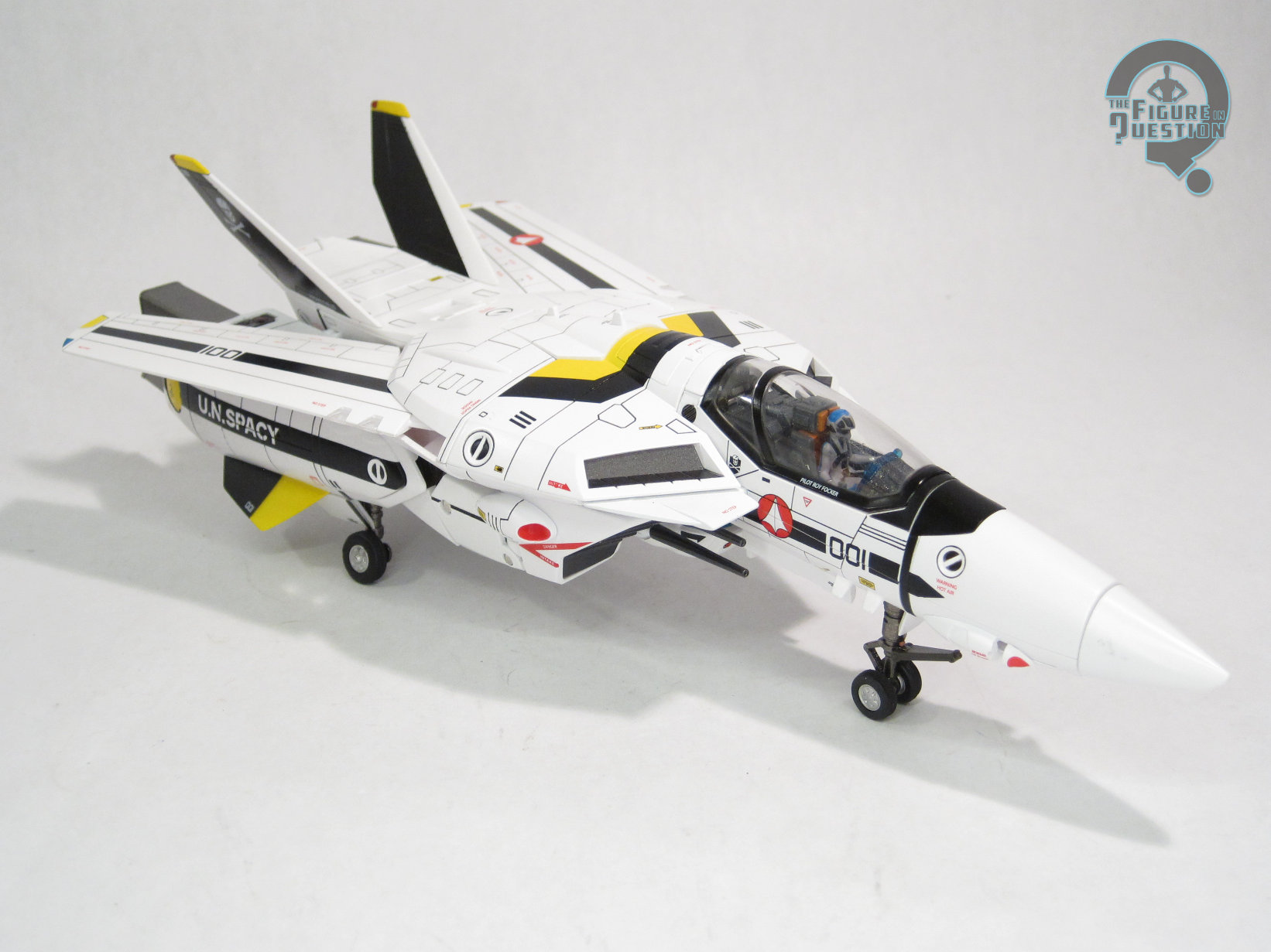 transforming Veritechs, you get the main Battloid mode, the Guardian mode, and the Fighter mode. To get from Battloid to Fighter (robot to jet), you stop in the middle for Guardian, which is…well, it’s kind of silly, and it’s not really so much a mode as it is just stopping midway. Of course, given how nerve-racking the actual transformation process is, a break at the halfway point isn’t so bad an idea. Even following the instructions, I was left to throw my hands up a slightly improvise a few times, and I had at least one point where I very seriously considered running this review without photos of the alternate modes. Thankfully, the rest of the transformation to full Fighter mode isn’t quite as bad, nor is the reverse transformation back to Battloid (apart from the one pin that fell out during the transformation back. It’s okay, it’s not entirely structural…). The Fighter mode is actually pretty nice, and I do really like the little teeny, tiny Roy figure in the cockpit.