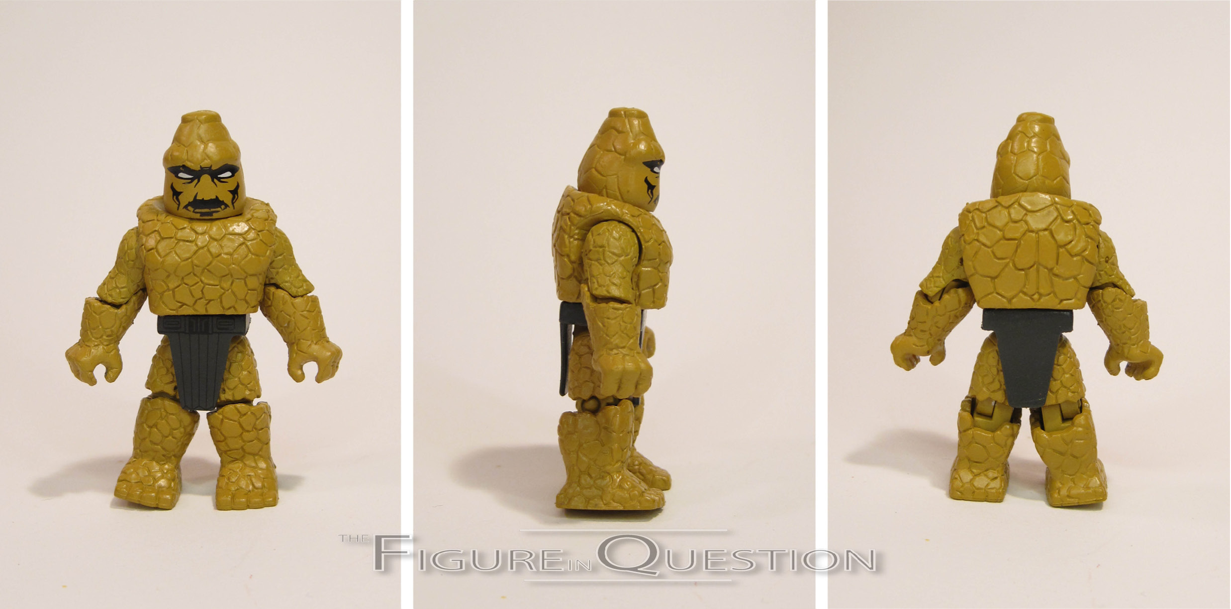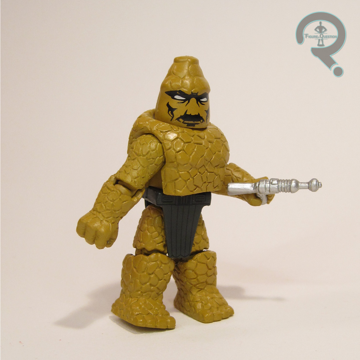 The Kronan Stone Men, or as they were then known, the Stone Men of Saturn, were Thor’s very first antagonists, appearing alongside him in Journey into Mystery #83. Though never incredibly prominent, they’ve been hanging around the Marvel Universe ever since, and, most recently, gained a little bit of notoriety via Korg, the goofy, inept stone man from Planet Hulk and Thor: Ragnarok. Though I’ve no doubt their presence in Thor’s debut certainly played a part in getting them this slot, I’d say the biggest push to include them in this series was parts re-use. Apart from the head, which is a unique piece depicting the Stone Man’s pointier noggin, these pieces were all sculpted for prior figures. The bulk of the pieces come from the re-worked Thing minimate from Series 37. Technically, the hands are new, since they didn’t make it onto the production version of that figure, but they were certainly sculpted for him. Given the similarities between the Thing and the Stone Men, the re-use is certainly sensible. The skirt piece is from waaaay back in wave 1 of the line, borrowed from Elektra. It’s a somewhat archaic piece, and certainly more geometric and flat than more recent offerings, but for the Stone Men it works. The Kronans’ paintwork is decent enough. Not particularly thrilling or anything, but that’s the Stone Men. They’ve gone with their brown/tan coloring from JiM #83’s interiors, rather than the green from the cover. This also allows for an easy enough conversion to a comics version of Korg, which is a nice bonus. The Stone Man is packed with two different styles of blaster, in both large and small sizes. Both were new to this particular figure, and the pairing allows for some different options for army building.