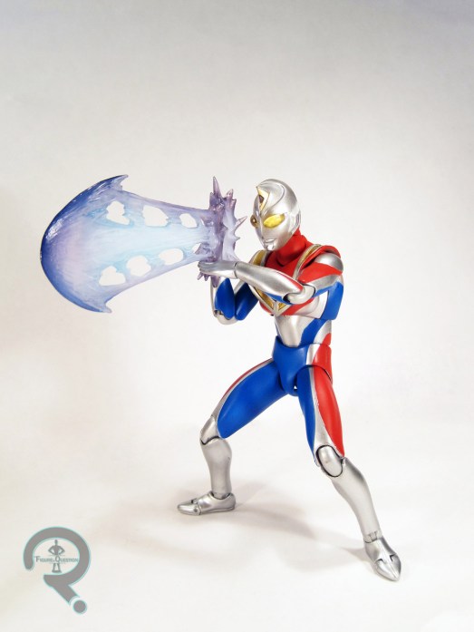 energy ball, and a hand with a beam. Like with the other two, the color timer’s a nice addition, but I don’t have much use for it. The extra head is nice in theory, but iffy in execution, as light piping seems to always be. The alternate shoulder piece is similar to Taro’s, allowing the shoulder to go into deeper poses, but Dyna’s is folded on both sides to allow both shoulders to move. The hands are similar to the ones with the others, though the energy beam is more expansive, which fits a more modern Ultraman. The thumbs up is also cool, and I quite like the hand with the ball of energy. As with the others, the hands really add a lot to the figure.