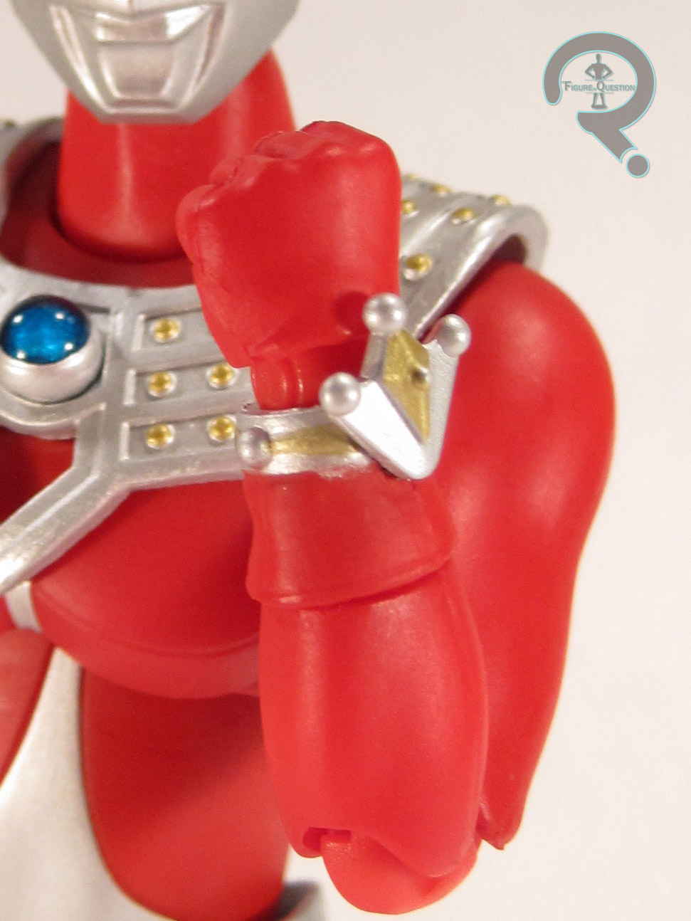 show, so I can’t really complain. The paint is somewhere in between the previous two. It’s really good for the most part, but there’s a tiny, tiny bit of scuff on his chin. Nothing horrible, just somewhat noticeable. Everything else is nice and clean. Continuing the trend of the others, Dyna has a nice variety of accessories. He includes the requisite red color timer, an alternate light-piped head, a plug to allow him to be connected to a stand, an alternate shoulder piece, and 9 hands: fisted (L and R), Karate chop (L and R), splayed (L and R), thumbs up (R), a hand holding an