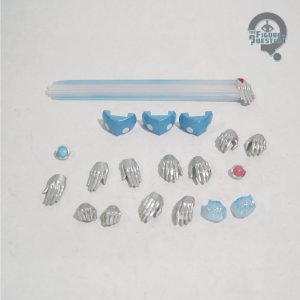 really well. The detailing is very clean, and captures his design quite nicely. Like Tiga, Trigger’s main color scheme is a balance of silver, purple, and red, with a bit of gold accenting worked in. Truth keeps that general set-up, but adds some additional black accenting, showing the elements he’s gained from his “Dark” form that figure into Truth. It adds a nice pop to the design, which helps the other elements stand out even better. Trigger Truth was packed with five pairs of hands (in fists, relaxed, two styles of flat, and open gesture), an additional hand with a True Zeperion Beam effect attached, and his True Timer in two different colors.