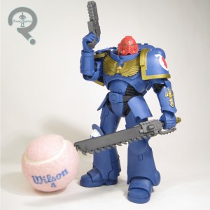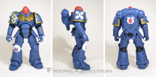 little sleeker than the traditional Space Marine helmet; the mouth plate is now smooth and without the notable rebreathers. He also gets a slightly more involved back pack, a tabard, and a handful of different items hanging off his belt, to say nothing of his various ribbons, which I assume have to do with his service achievements. It all makes for a look that’s very involved, but thankfully not busy. Like the design, the sculpt certainly has a lot going on; there’s many layers and ornate fixtures to the design, mimicking the very detailed nature of the game miniatures quite well, while also adapting him to a larger scale. The details are quite sharply handled, and there’s a depth to them that wasn’t quite there on the McFarlane offerings. The more ornate parts of the armor are definitely sharper, that’s for sure. While the McFarlane figures kept their paint work rather on the more basic side (a side effect of the lower price point on the figures),