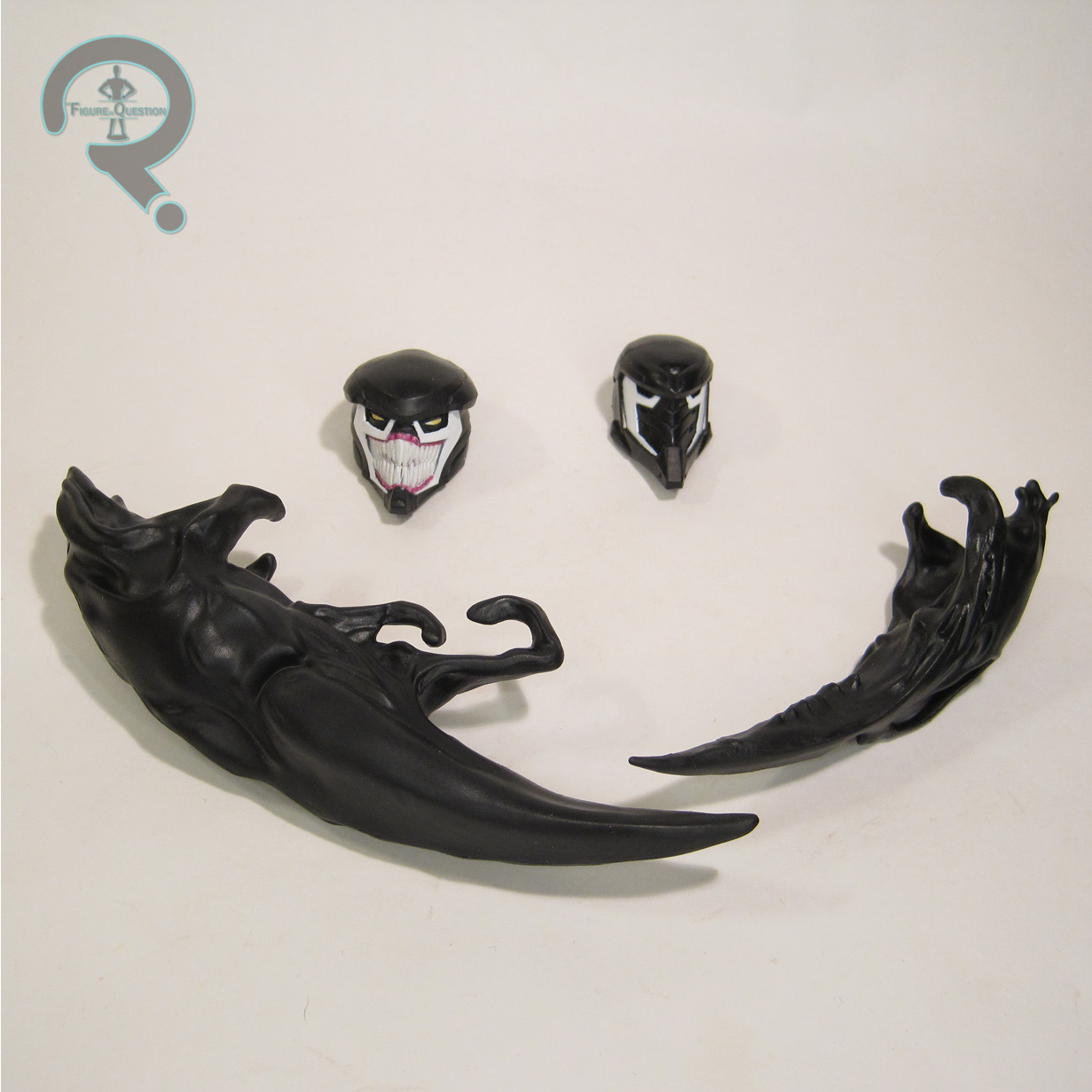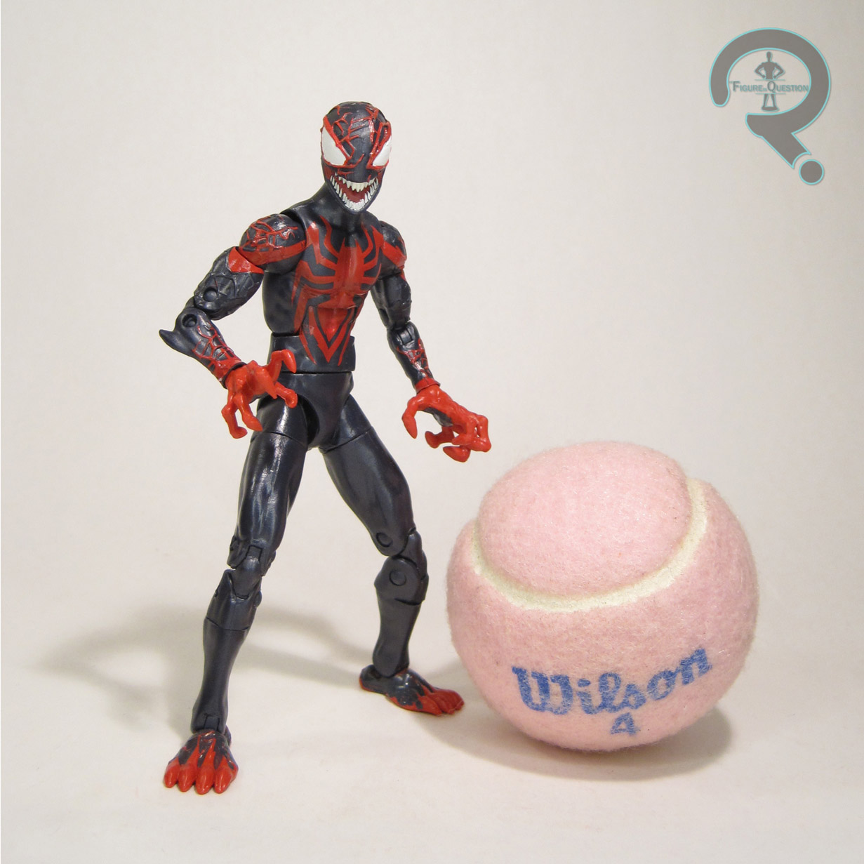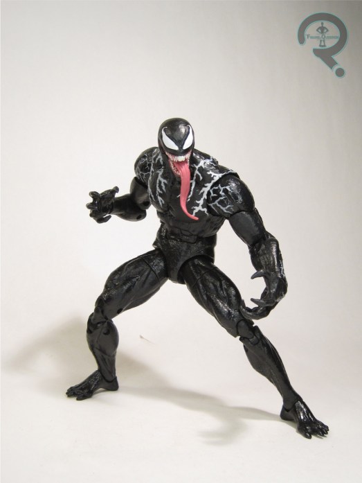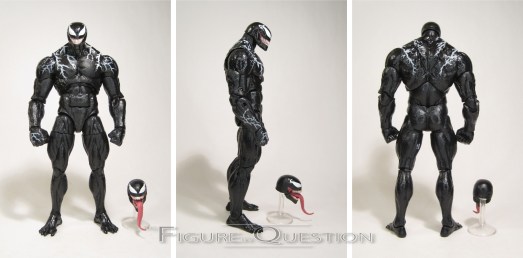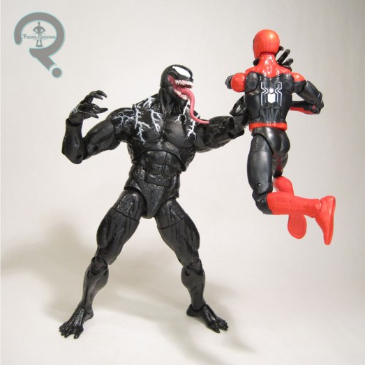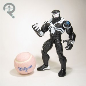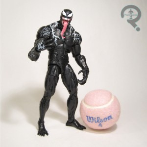 Venom. Yay. Venom. I totally bought this set for both figures, and not just the one. Of course. I totally know all of the facts about the different Venoms, too. Like, this one’s…blue? Cuz of the sprite. That’s why. The figure stands 7 1/2 inches tall and he has 32 points of articulation. Like Cap, the classic Eddie Brock Venom’s gone through a lot of different mold variations. This appears to be the same mold used for the Amazon three-pack Eddie that came with Riot and Agony, which itself was based on the Omega Red molds. It means he’s still got visible pins on the knees, but otherwise modern articulation. It’s not a bad sculpt by any means. It feels very true to the character, and the heads both