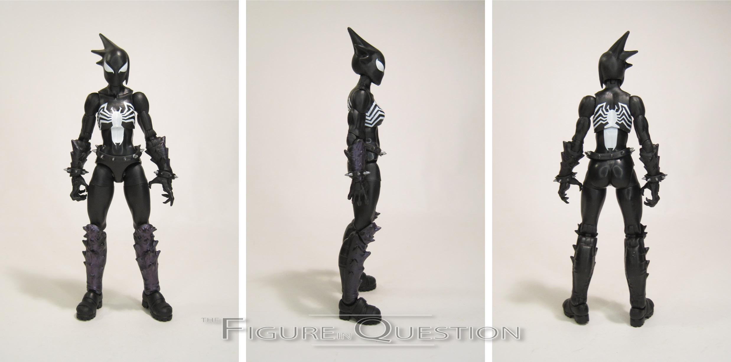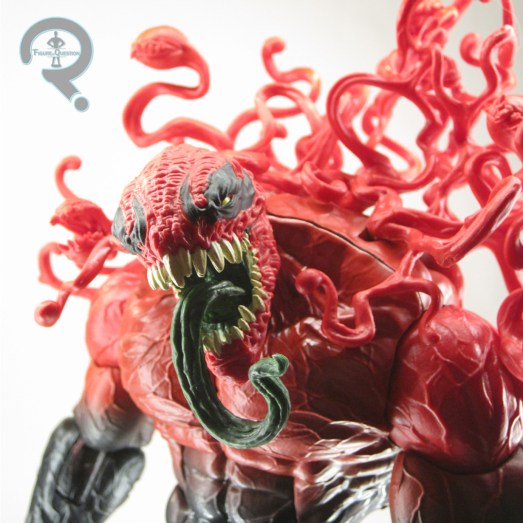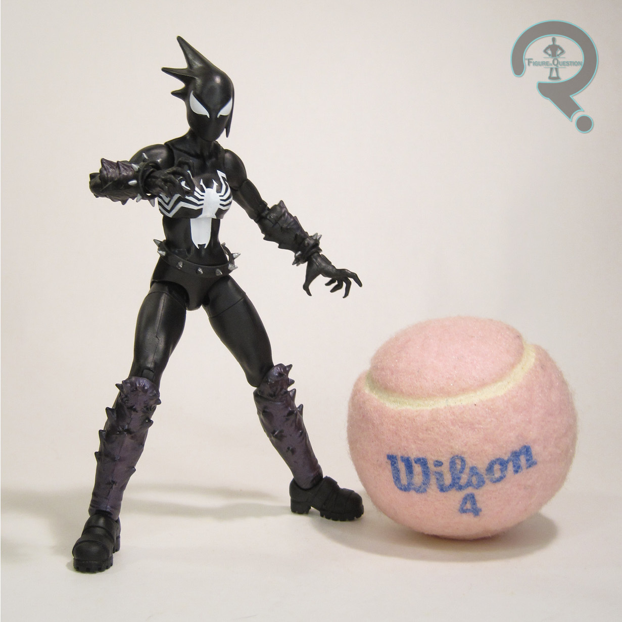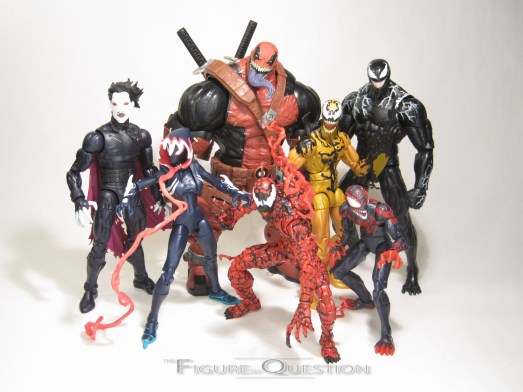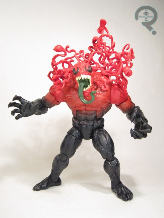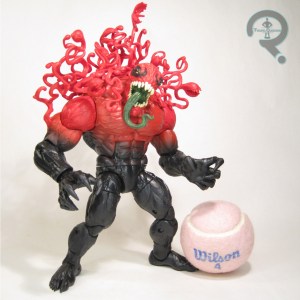 Venom. Yay. Venom. I totally bought this set for both figures, and not just the one. Of course. I totally know all of the facts about the different Venoms, too. Like, this one’s…blue? Cuz of the sprite. That’s why. The figure stands 7 1/2 inches tall and he has 32 points of articulation. Like Cap, the classic Eddie Brock Venom’s gone through a lot of different mold variations. This appears to be the same mold used for the Amazon three-pack Eddie that came with Riot and Agony, which itself was based on the Omega Red molds. It means he’s still got visible pins on the knees, but otherwise modern articulation. It’s not a bad sculpt by any means. It feels very true to the character, and the heads both