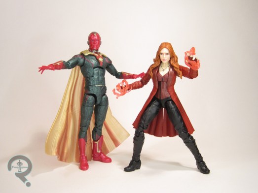 Vision sculpts. He also gets a new cape piece. This one, I’m not sure I like as much as the Retro card version, but it’s not bad. I think it’s just the upward flow at the ends of the shoulders that’s bugging me; it makes it seem like the cape is meant for a bigger figure, and just stuck on this one. The Retro Vision’s color scheme went metallic, at least for the green. This figure takes him back to all flat colors, and I think it works. It’s quite striking. The base application is generally clean; the boot and glove tops are a little odd, but not awful. I particularly like the darker accenting on the face, which really brings out the details in the face sculpt. Vision is packed with two sets of hands: fists and open gesture. After too many Visions stuck with only fists, I’m glad he’s got the option in place. He’s also got the head to the Void Build-A-Figure.