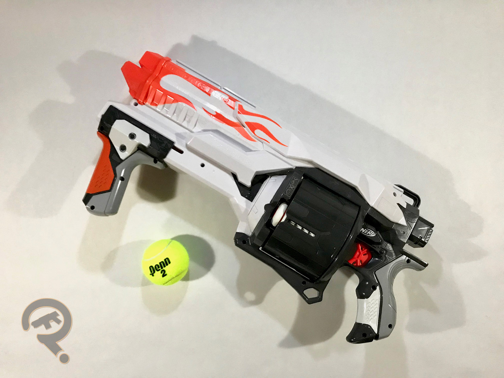 I think the Vortex line has perhaps the weirdest naming scheme of any group of Nerf blasters. You start out with the Proton and the Praxis, both real words. Maybe they’re going for a pr- naming pattern here, but then you get the Vigilon. Huh. That’s not a word, but ok. Follow that up with the Nitron. Ok, that’s just close enough to being a real word, I’m just annoyed. There’s already a Proton, why not commit and call it the Neutron? “But Tim, it’s got nitro in the name to emphasize how fast it is.” I hear you say. But is it fast? Is it really? That’s a question for the rest of the review to answer.