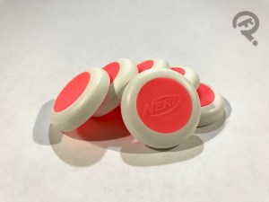 the trigger is the magazine release for the forward magazine well. The ergonomics are decent as all of the controls are easily accessible and there aren’t any sharp edges or abrasive textures. The stock feels a little long for the rest of the blaster, and I keep getting the feeling like maybe it should be fired from on top of the shoulder like a rocket launcher. Now the performance. The “nitro” part. It uh… it’s slow. It’s real slow. I mean, it shoots mini frisbees, so they fly a good long ways, but they’re really not in a hurry. Even the rate of fire is leisurely at best. Sure, it’s big and looks impressive, but unless your younger siblings are completely paralyzed by fear when you bust into their room, you might have a harder than usual time actually trying to hit them. The Nitron requires 6 C cell batteries to fire, and the included scope takes 2 AA batteries. The Nitron comes packaged with the scope, a 20 round magazine and 20 Vortex discs.