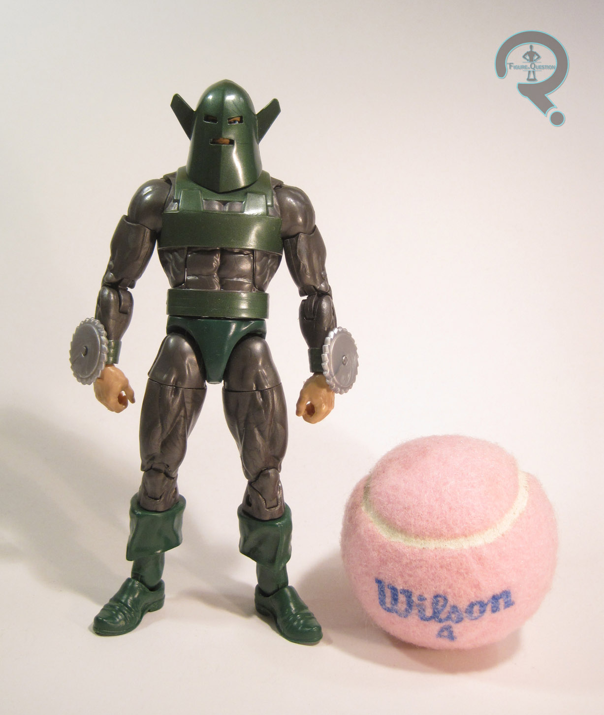Whirlwind was released in the second series of Toy Biz’s Iron Man toy line. He’s based on his animated incarnation, which was in turn based on his classic costume, more specifically his second costume design after he added the chain mail and also added a shirt. Thank you for that, Whirlwind. The figure stands about 5 inches tall and he has 9 points of articulation. The articulation on this one is kind of interesting because it’s a sort of a mix of unique and kind of basic. He loses the knee joints, which had become fairly standard of this point, but has disc and peg shoulders. The shoulders are rather loose in order to facilitate his action feature. He also has a waist swivel, but again it’s restricted to facilitate his action feature and isn’t really much for posing. His sculpt is pretty much on par with what we expected from the line. He is a little on the bulky side, but also not bad for Whirlwind. The chainmail detailing is actually pretty good. The hands and feet seemed rather large, and conversely the helmet feels a little small, like it might be difficult