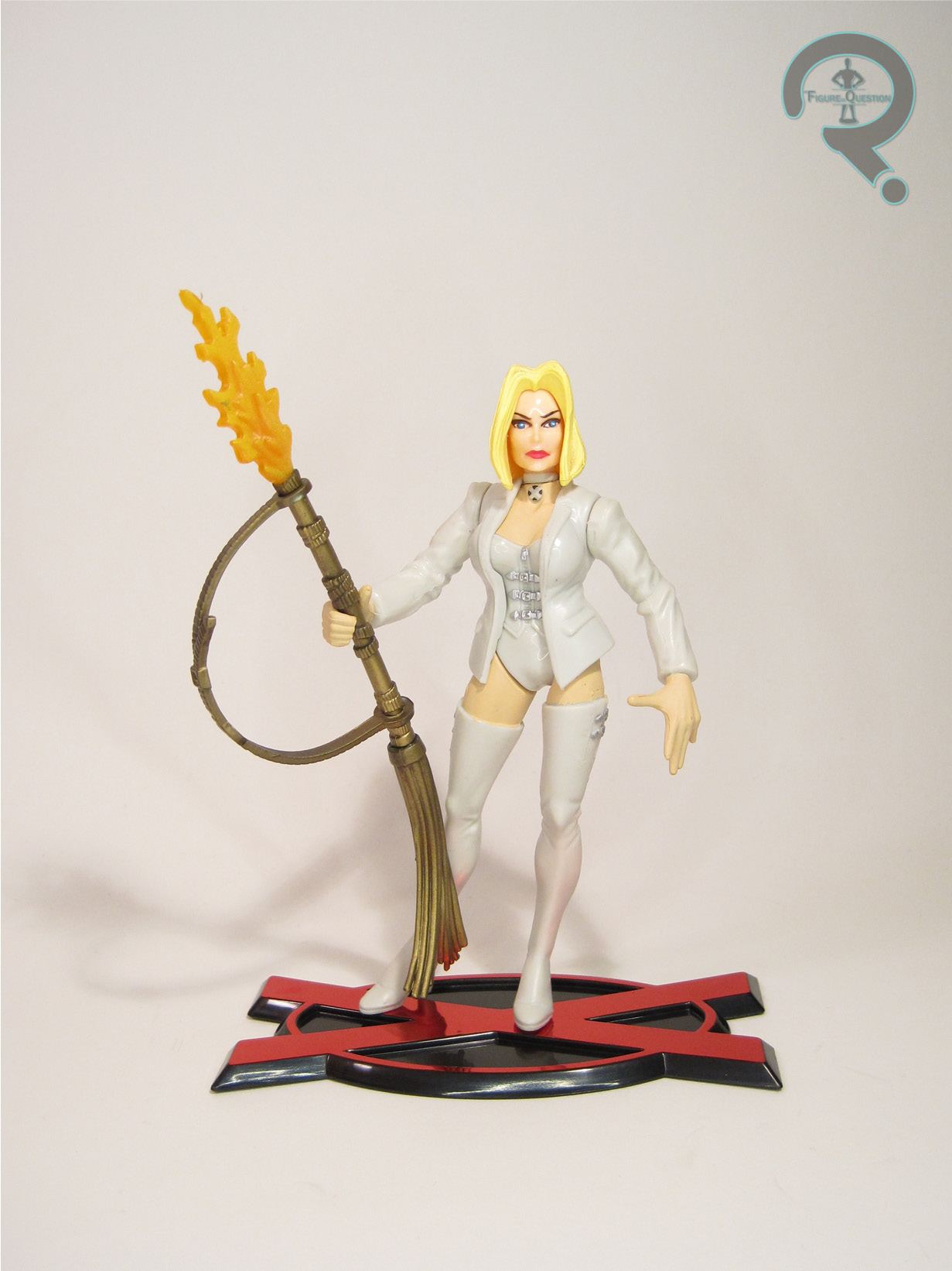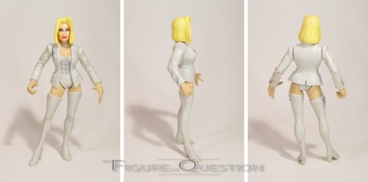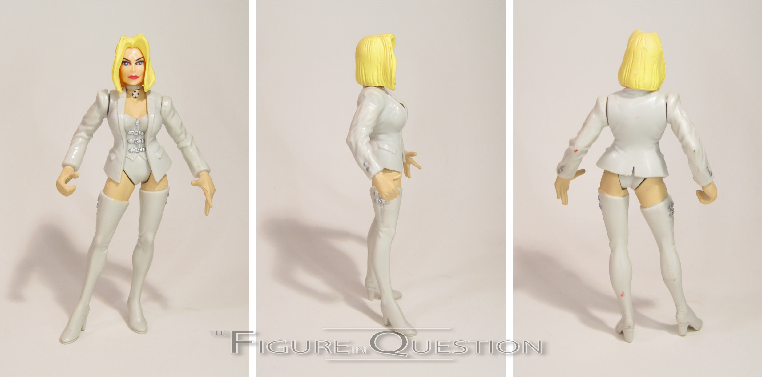 Emma Frost, the White Queen, is no stranger to Marvel Legends, though until recently she *was* a stranger to *good* Marvel Legends, with her debut in the line, as part of Hasbro’s very first series of Legends no less, being one of the very worst figures Legends has ever spawned. Her classic costume, which is admittedly rather on the risque side, has only been done in Minimate form before this, which certainly contributed to her being the biggest pull of thus here set. The figure stands 6 1/4 inches tall and she has 27 points of articulation. Emma got a lot of new parts, for her torso, upper arms, and cape, as well as re-using the alternate head from her Walgreens figure, and filling in the rest with the TRU Storm body. It does unfortunately mean that she’s got visible pins on the knees, which is sort of a bummer, and also that her legs are a bit prone to warping and generally making it hard to keep her standing. It was not easy keeping her standing for the photos here, I tell ya. The new pieces are generally pretty nice, though. The corset piece certainly does what it’s supposed to, and looks the part, and does so in a way that’s sharply sculpted, and reasonably well proportioned. I do like that all of the elements of her outfit barring the boots have proper raised edges sculpted, so we’re not just relying on paint for the break. Even the boots break at a joint line, so it’s still the same general concept. The Walgreens head, which I hadn’t looked at before, is certainly a solid sculpt, though maybe a more generic than Byrne depicted her. I’m not crazy about the cape, which is very thick and heavy, and virtually makes her unposeable. It’s good for standing there and not much else, it seems. Her paint work is pretty minimal, since the sculpt has so many separate pieces, but what’s there is decent. My figure’s just a touch wall-eyed, but generally things look good. Emma is without any accessories. Not even an extra set of hands. That’s definitely weak.