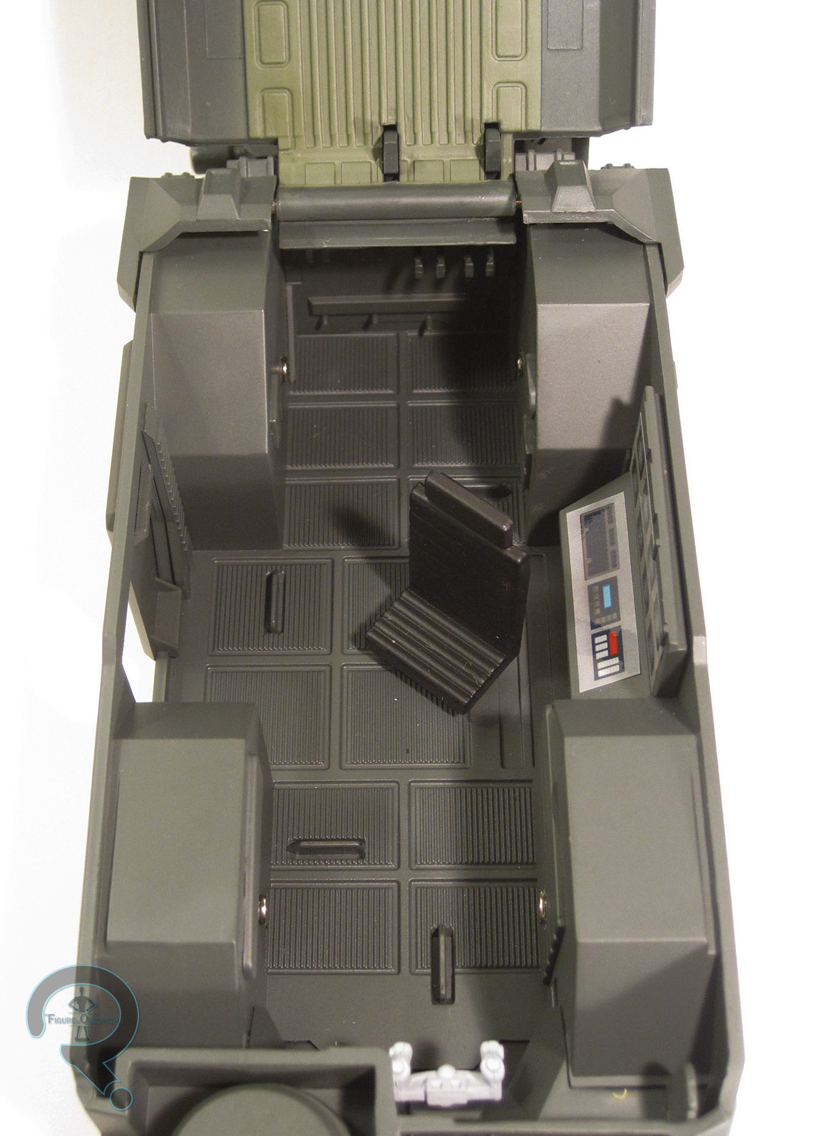 sculpt of the APC is pretty good. It’s noticeably less deformed than some of the prior vehicles, which I’m quite pleased with. Obviously, it’s downscaled ever so slightly, but not incredibly so; it’s quite a sizable vehicle. The top of the Carrier is hinged, allowing access to the interior of the vehicle. It’s at best an approximation of the actual interior seen in the film. That being said, it’s totally acceptable, since the interiors we see on screen were a separate set that didn’t actually fit in the vehicle used for exteriors. Any recreation by definition must make some concessions. Gorman’s station is there, with a swivel chair and everything. There are four more seats: the driver, right behind the driver, by the door, and