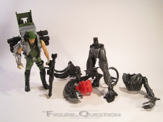 Hudson is easily the selling point of this set. His Series 3 figure never saw a proper US release, leaving a Paxton sized hole in many fans’ Aliens collections. Hudson is about 5 inches tall and he features 6 points of articulation. He sports a new head sculpt, which doesn’t really have much in common with Bill Paxton’s portrayal of the character, but that’s not really news with this line. Hudson has a screaming expression, which fits okay with the character and does make him stand out a bit more from the other, more passive Marines. His sculpted helmet doesn’t match the one on Hicks, which is moderately annoying, but I suppose they wanted each of the Marines to have a unique look. From the neck down, Hudson’s sculpt is the same as Series 1’s Apone figure. Aside from the somewhat odd metal arm thing, it’s a pretty good starting point for a basic Marine, so I guess it works okay. It’s too bad he couldn’t get a unique sculpt like Vasquez, but if only one could get a new sculpt, Kenner made the right choice. Hudson’s paint work is on par with the rest of the Marines; it’s all pretty cleanly applied, and his lower half is molded in the same multi-colored plastic seen on all of the Marines. Hudson has one of the more diverse paint jobs in the series, though it’s not like it’s anything super exciting. Hudson includes a rifle of some sort (not a pulse rifle), and a large backpack thingy with three missiles to launch. Unfortunately, the backpack is a bit on the heavy side, which makes Hudson impossible to stand while wearing it.