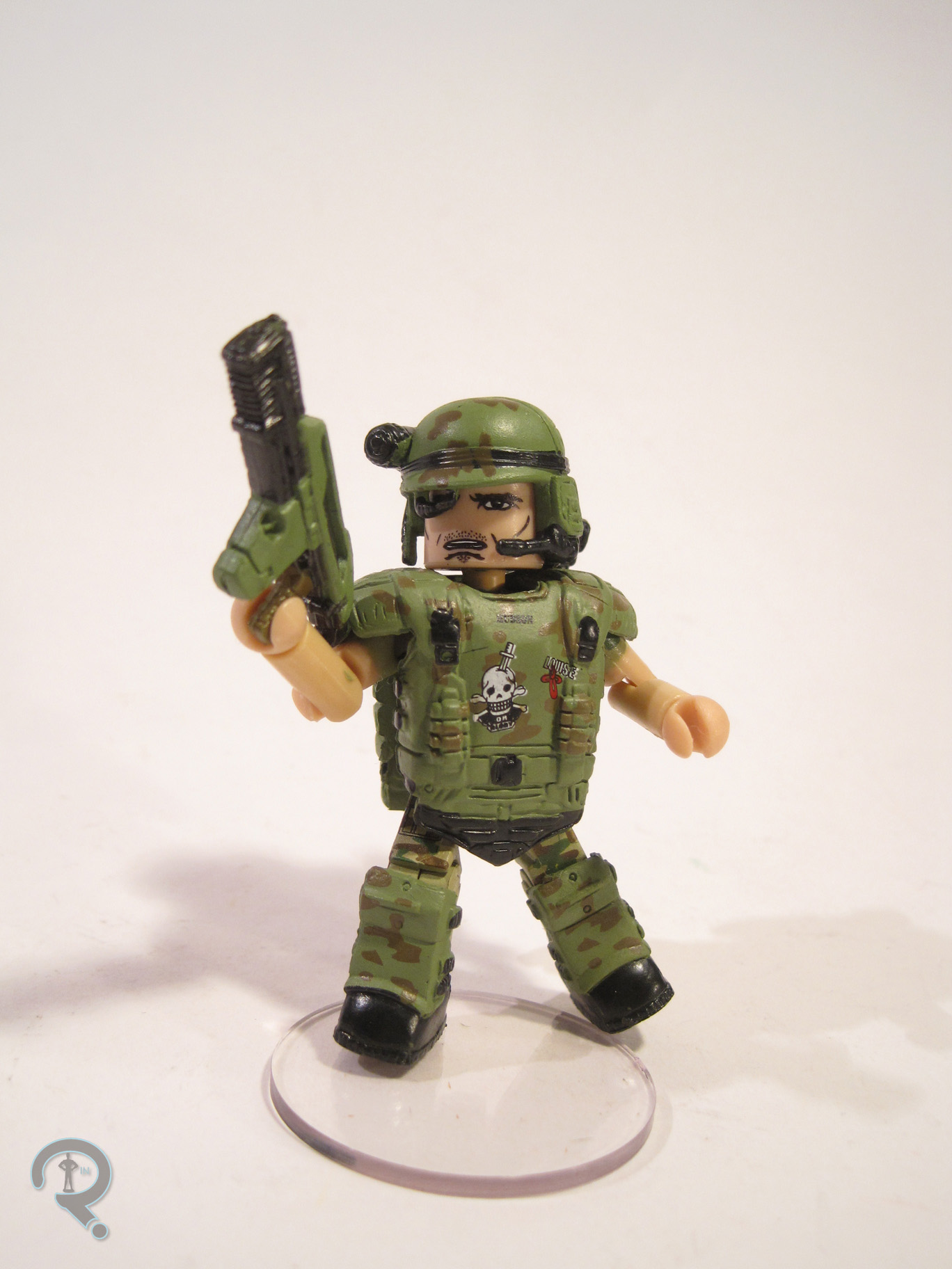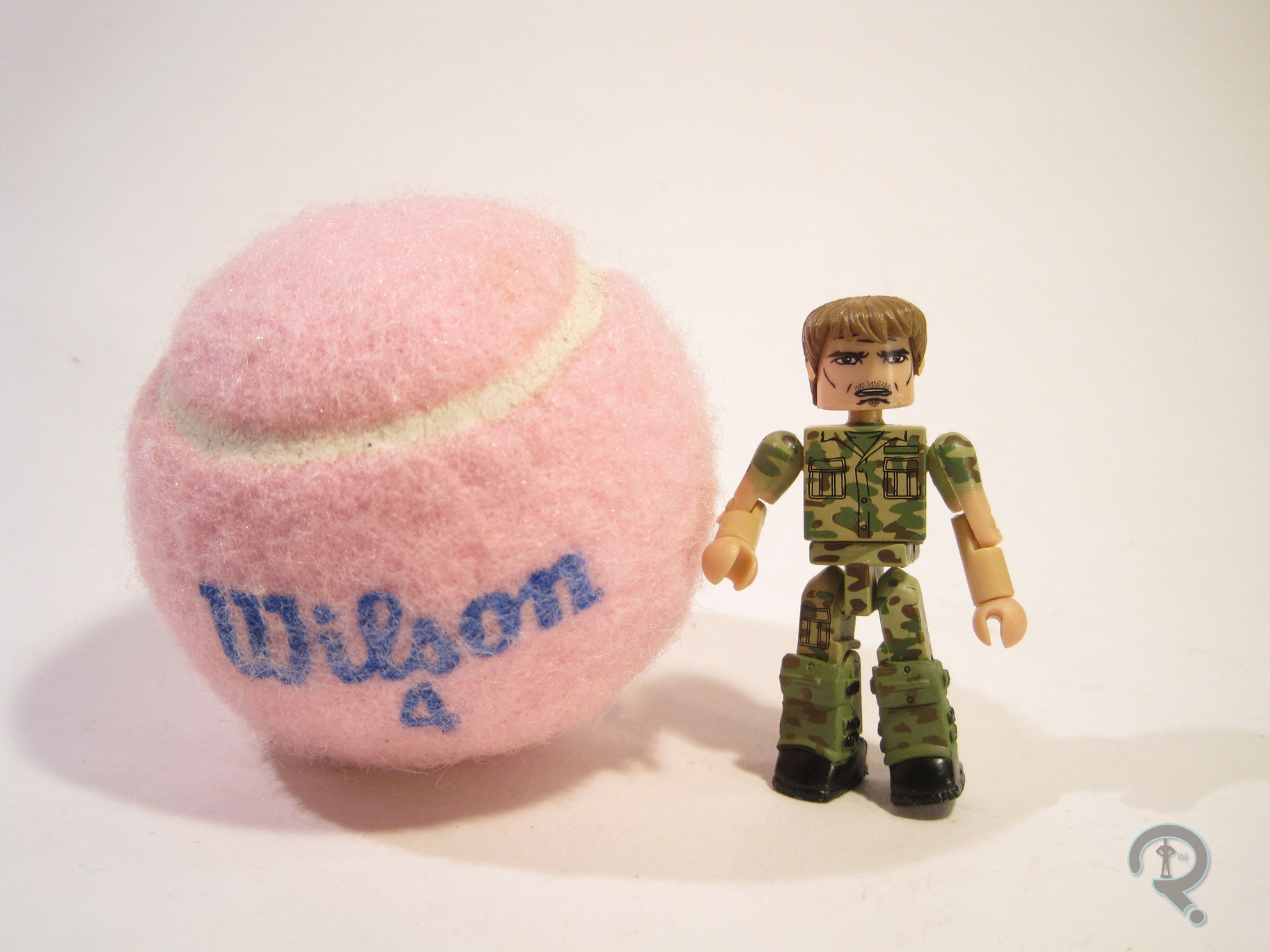 HudsonXeno2So, let’s get something out of the way right now: Hudson isn’t a Corporal, he’s a Private. The package totally gave him the wrong rank. But, I’m probably one of the few people to actually notice such a thing, so, whatever. Hudson is probably one of the film’s more memorable Marines. He’s got a fair bit of screen time, and, whether you like it or not, his panicky personality sets him apart from the rest of the crew. Anyway, he’s pretty important to the film and the line would feel very incomplete without him, so it’s good to see him turn up here. The figure stands about 2 ½ inches tall and has 14 points of articulation. Hudson features additional sculpted parts for his helmet, chest armor, and boots. These parts are all the same as those used on the Series 1 Marines and Weirzbowski. This is sensible, given that the armor was standard issue in the film. Hudson continues the trend of the removable shoulder lamp, which is a nice option to have. His is a little looser than previous versions, but it stays in place alright. The armor is all stuff we’ve HudsonXeno3seen a few times before, but it’s no less impressive than it was before, and it still does a great job of translating the real deal into ‘mate form. Hudson’s paintwork is pretty decent, but it does have a few nits here and there. The basic armor detailing and underlying fatigues match up with the rest of the Marines, which is good. The chest armor has most of Hudson’s distinctive graffiti; it’s cleanly applied for the most part and helps set him aside from the others. Hudson wore a cover on his helmet in the movie, which featured a slightly different camo pattern and an 8-ball on the back. However, the figure just has the standard issue helmet. It’s not the worst thing ever, but it is just a little disappointing. The likeness on the face isn’t spot-on to Bill Paxton, but it’s a lot closer than the other Marines in the line, so that’s good. On the accessory front, Hudson has an extra hairpiece, a standard issue pulse rifle, a facehugger, and a clear display stand. The rifle and facehugger are the same ones we’ve seen before, but if it ain’t broke, don’t fix it. The hair is one of the standard male hairpieces, first used for Marvel Series 27’s Ultimate Iron Man. It’s too long to really work for Hudson, and it’s definitely painted too lightly to be Paxton’s hair. But it’s the thought that counts, I suppose.